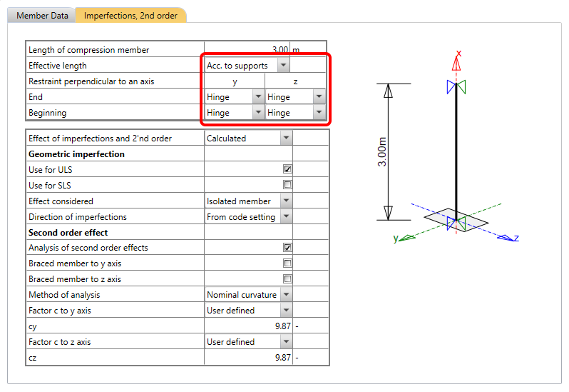 Effective length can be calculated automatically according to restraints perpendicular to the "y" axis or the "z" axis. This is done according to EN 1992-1-1 Figure 5.7, where the l0 is the Length of the compression member in the application.