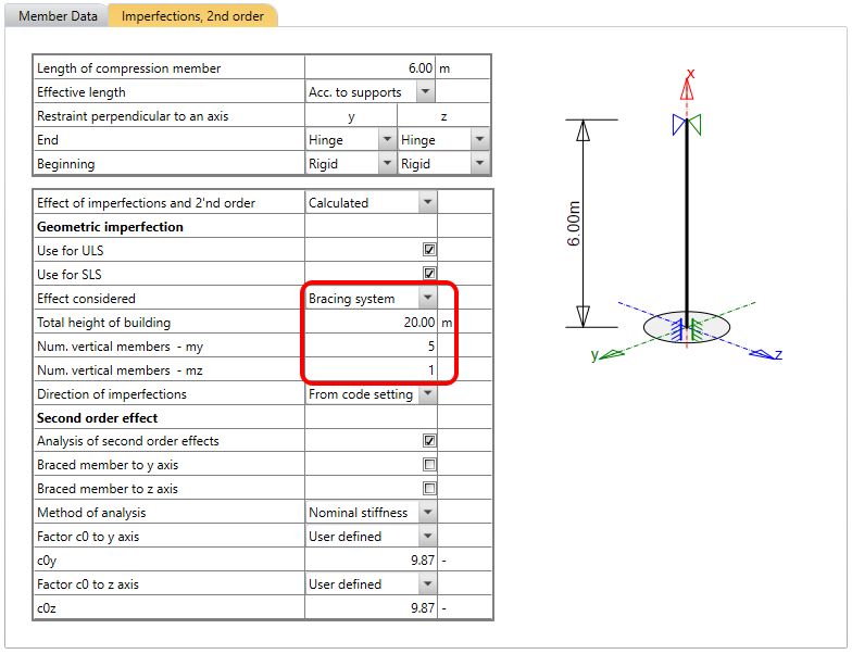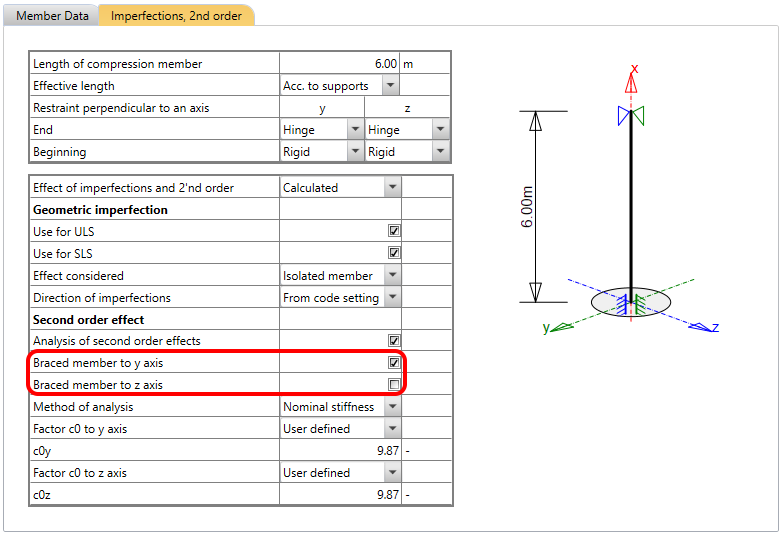 In the bottom part of the table, you can set the analysis of second order effects. Before you choose the calculation method, it is necessary to know if your member is braced or not and in which direction.