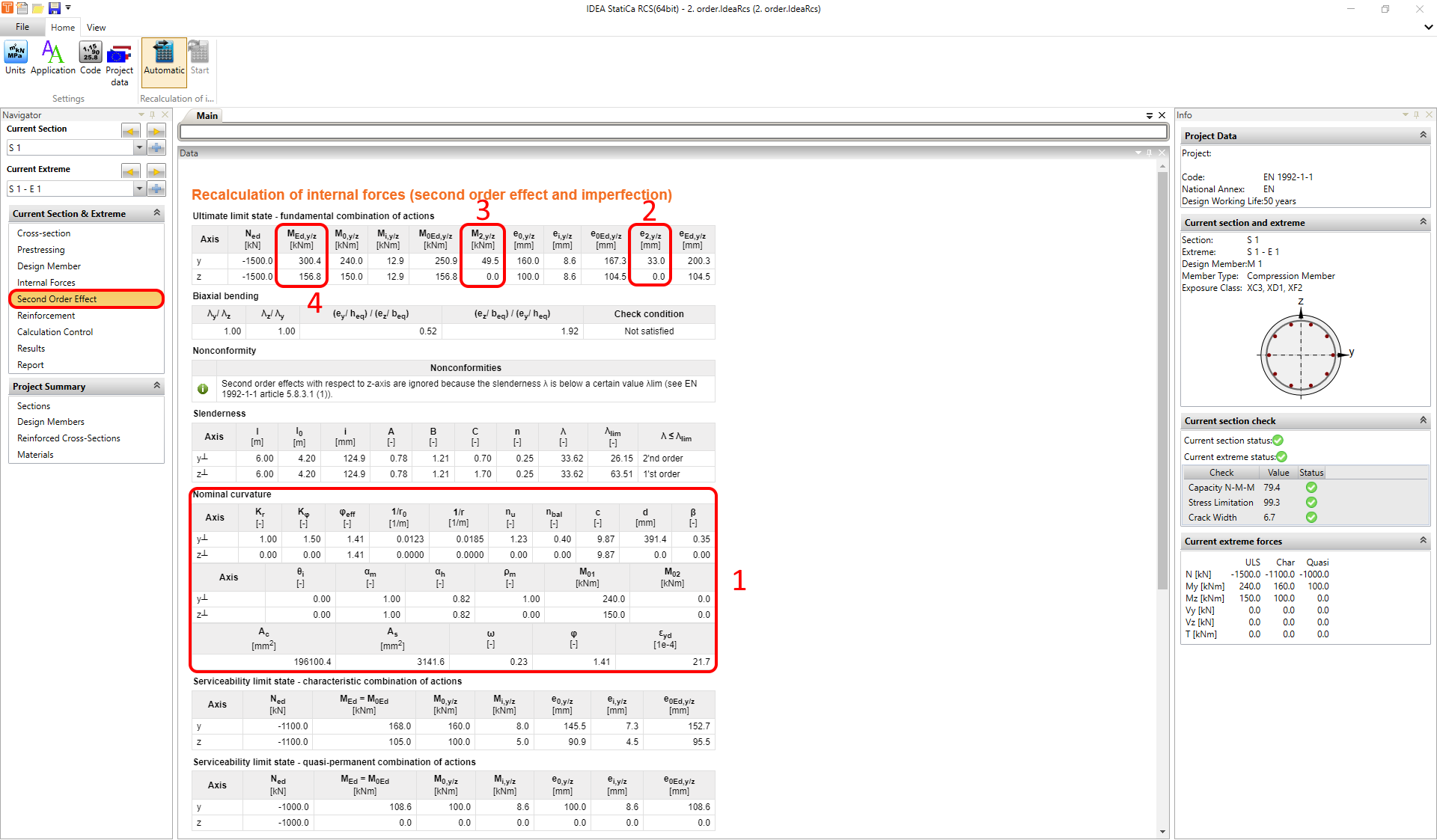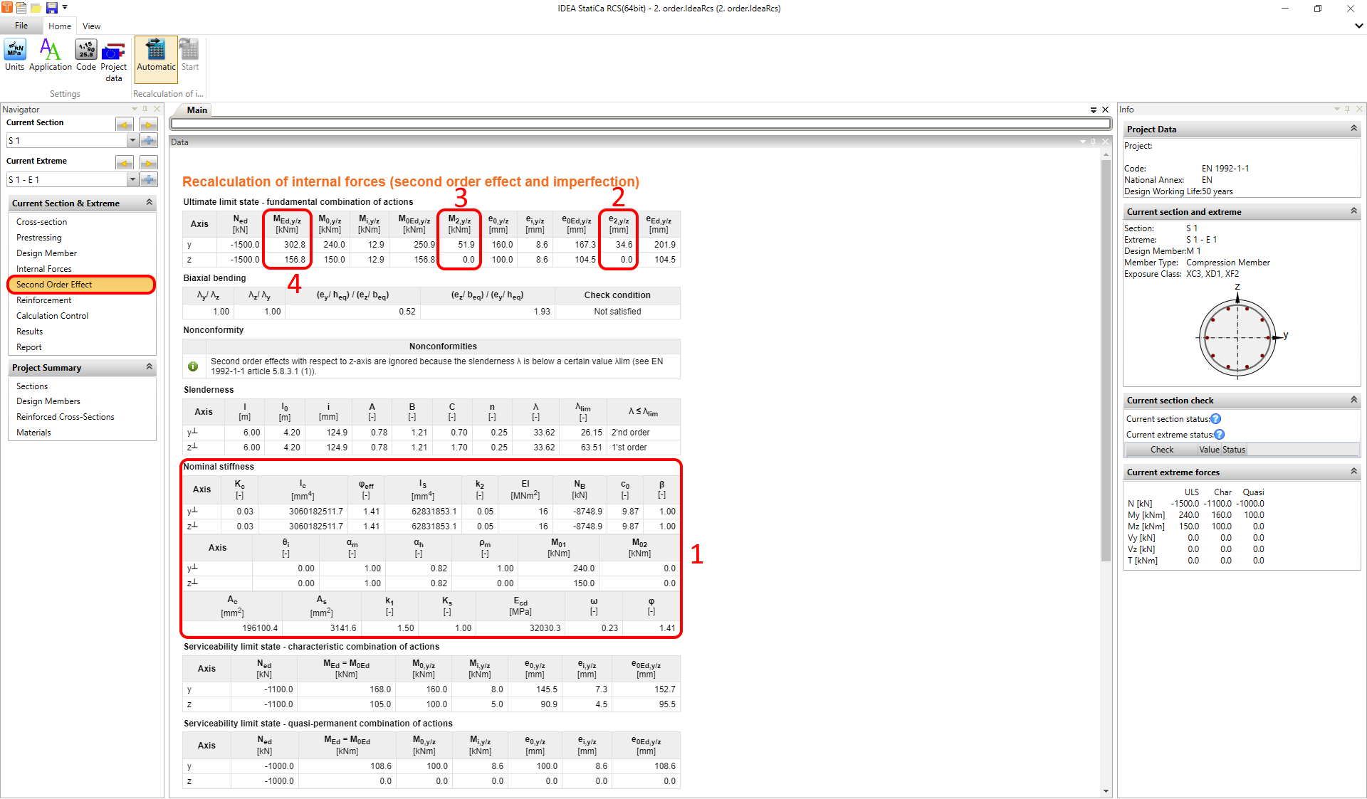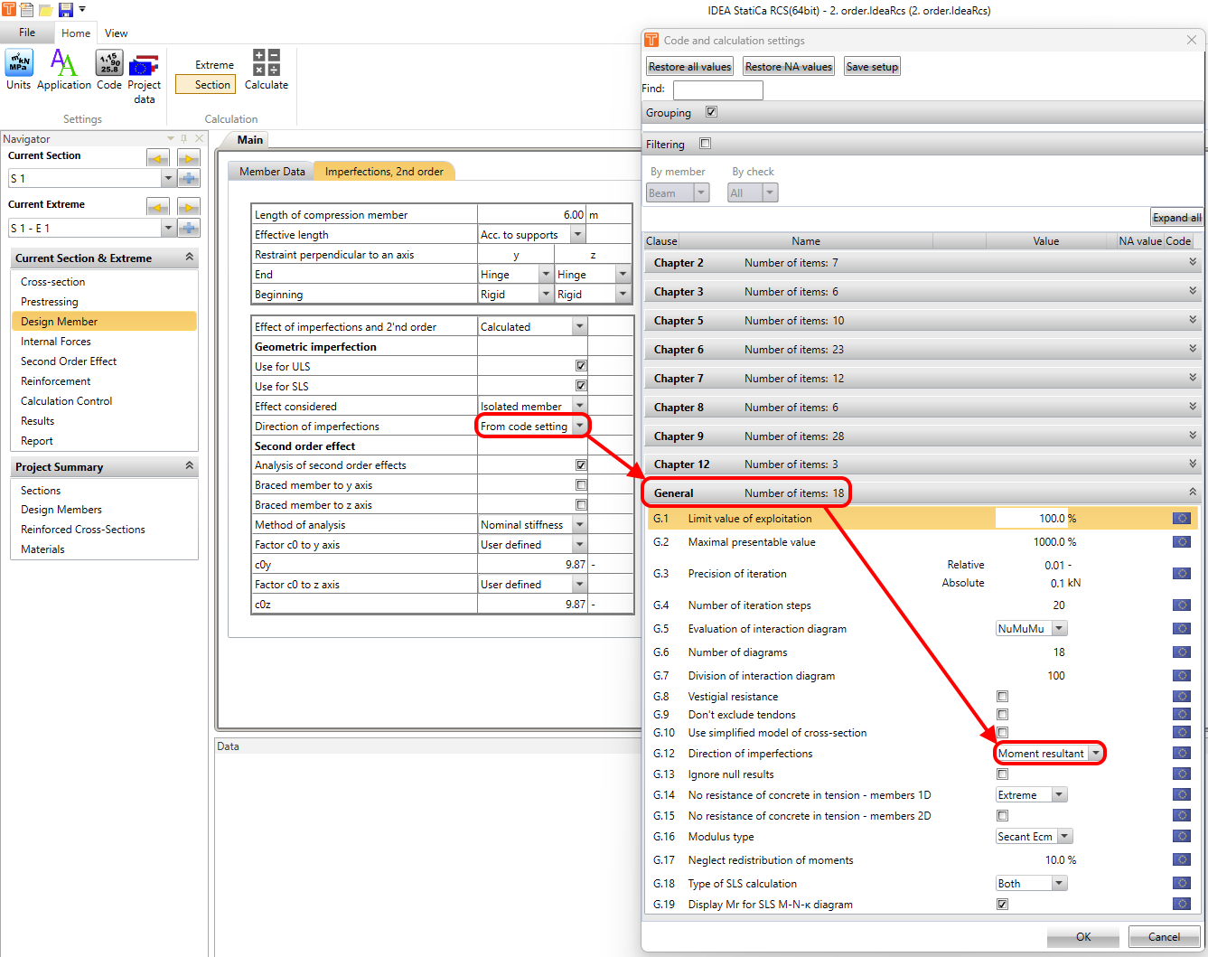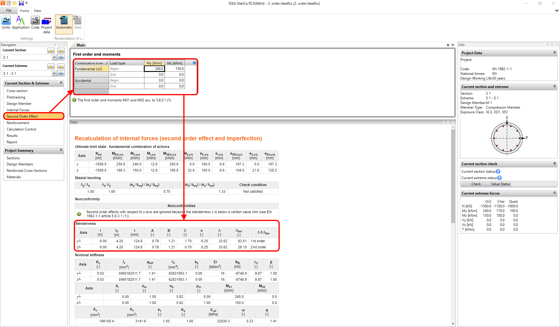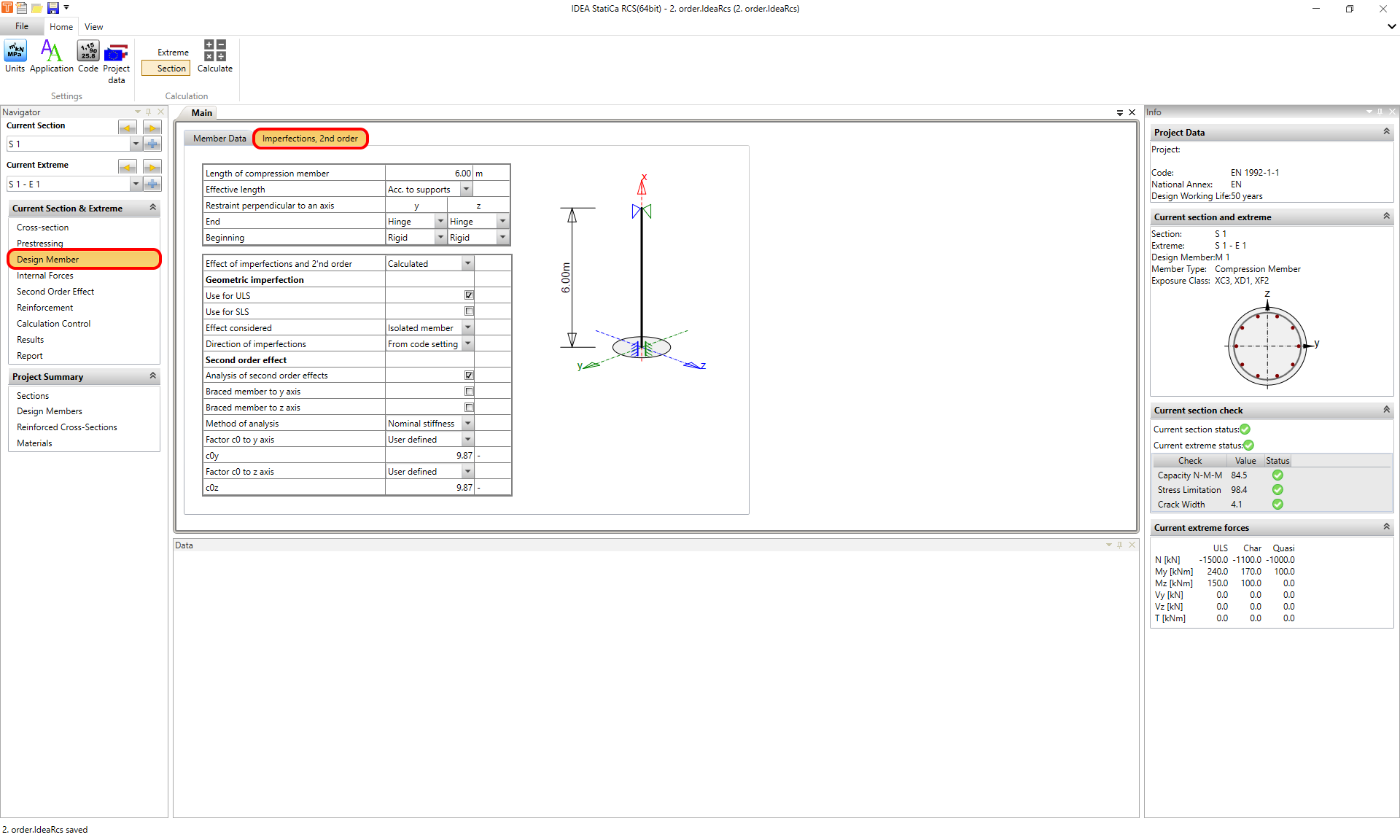 Once you have your cross-section created, loaded, and reinforced, go to the Navigator -> Design Member and select Imperfections, 2nd order. Here you can set the effective length and all parameters that are needed for the calculation of design internal forces.
