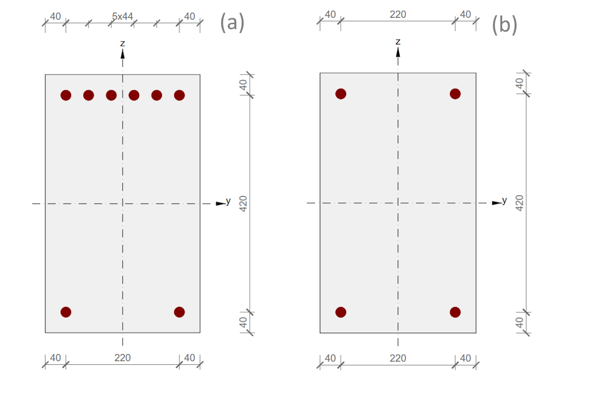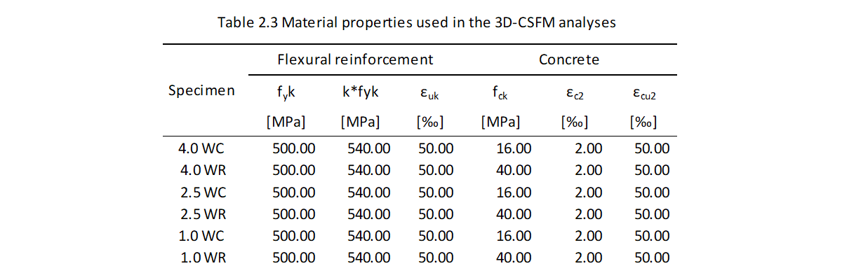 The material properties of concrete and flexural reinforcement used in the CSFM analysis are summarized in table 2.2. The yield stress (fyk) and the ultimate stress (k*fyk) of the reinforcement as well as the compressive strength (fck), plastic strain(ɛc2) and limit plastic strain (ɛcu2) of the concrete and were selected to clearly illustrate the behavior of the materials under stress.