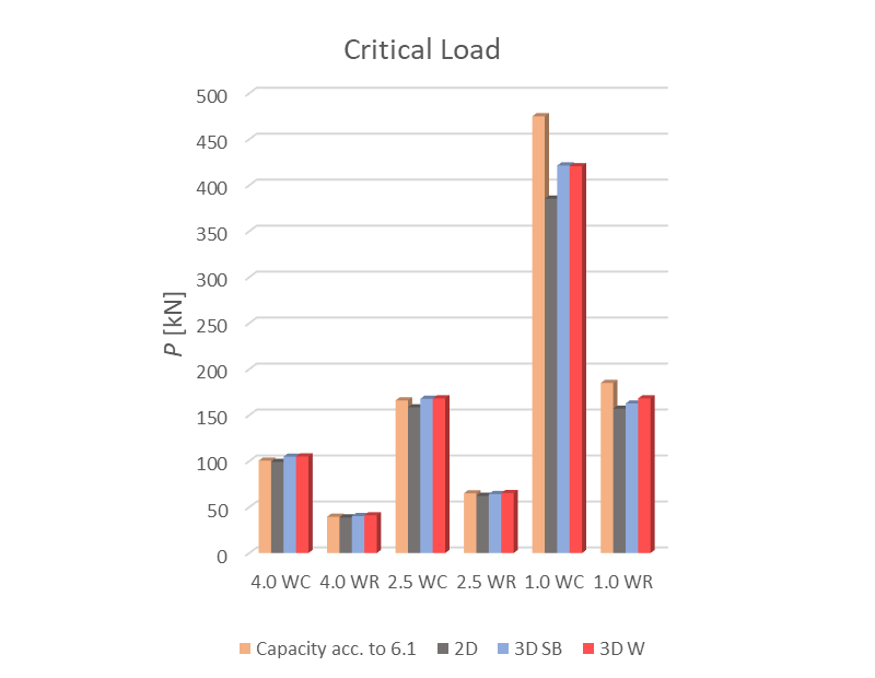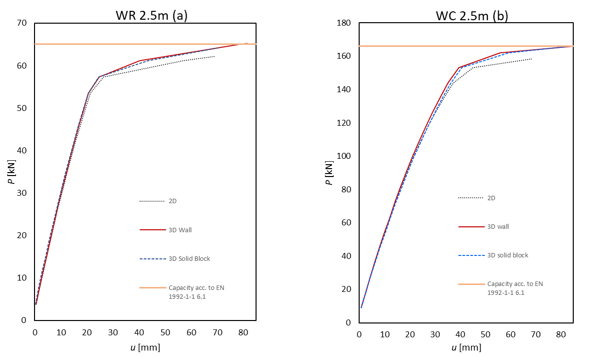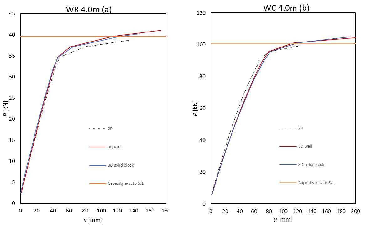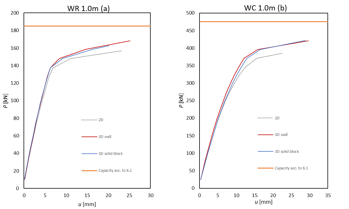 In the comparison figure 1.5 featuring six model variants distinguished by length and options of WC (weak concrete) and WR (weak reinforcement), the 3D methods generally exhibit a solid match. Notably, the 3D Wall model class's mesh factor was adjusted to 0.7 to equalize the number of elements across the model's height, making it comparable to the solid block general model. The 3D results are slightly higher than the 2D CSFM solutions, as expected due to the inclusion of triaxial stresses and simplifications in 2D CSFM. Analytical results align with 3D and 2D CSFM in most cases, except for higher values in short 1.0 m WC and WR scenarios, where shear interactions (concrete strut in compression) significantly impact but are overlooked analytically, explaining the lower values from 3D models. This is corroborated by 2D CSFM results.