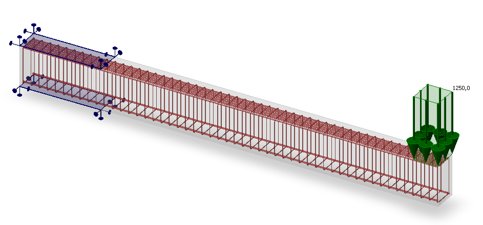 When defining the geometry of the tested specimen in the IDEA StatiCa Detail application (both 2D and 3D environment), the length was set as the variable length (1.0m, 2.5m, 4.0m) plus an additional 1.15 meters. On this additional length of 1.15 meters, supports were defined on top and bottom surfaces with rigid stiffness in all directions.