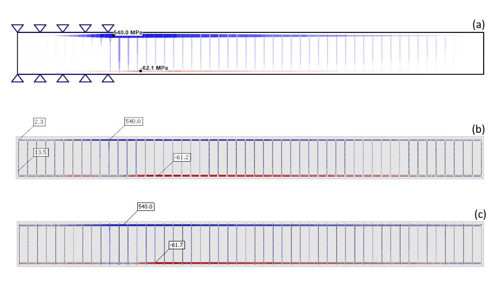 \[ \textsf{\textit{\footnotesize{Fig. 1.9\qquad Calculated value of reinforcement stress on WR 4.0 different model types: (a) 2D, (b) 3D - Solid Block, (c) 3D - Wall}}}\]