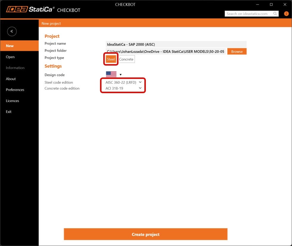 Select the New option with Steel project type, AISC design code and sub-code LRFD (AISC 360-16) and create project.