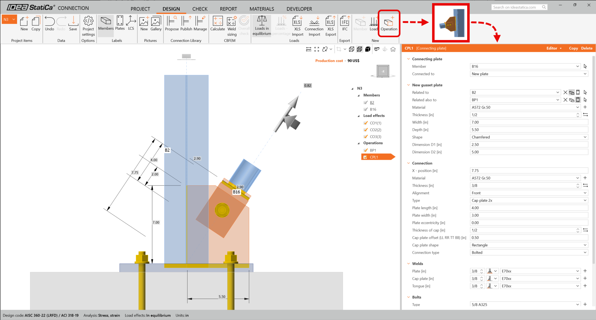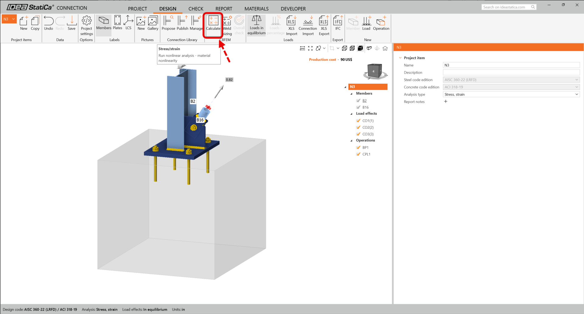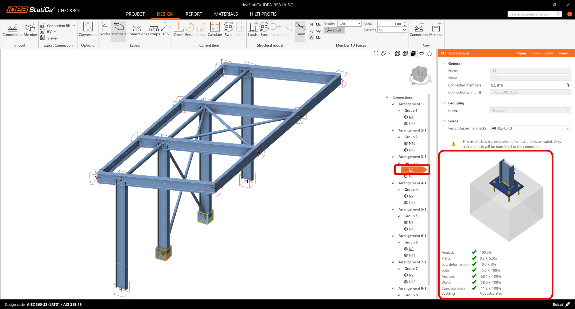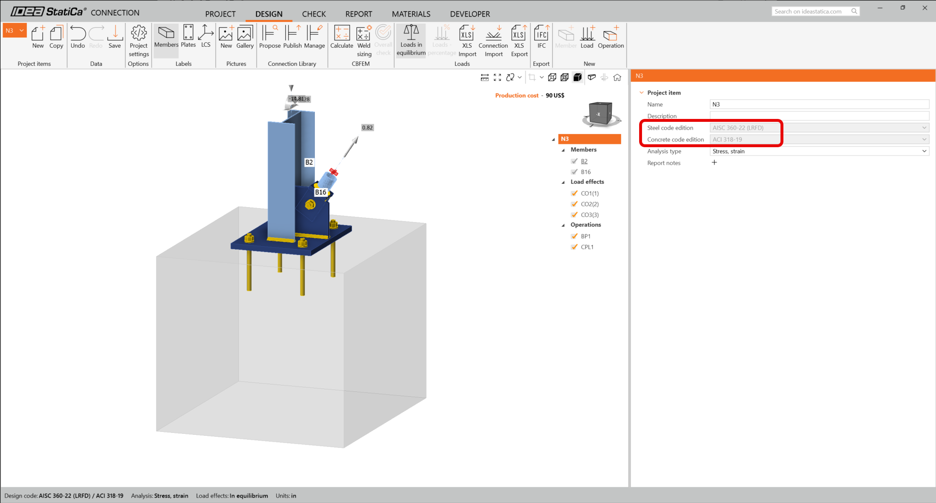 To run a code check, we must also make sure that the code is correct in IDEA StatiCa Connection. From the Design tab in the Connection label N3, ensure that LRFD 2022 is being used.