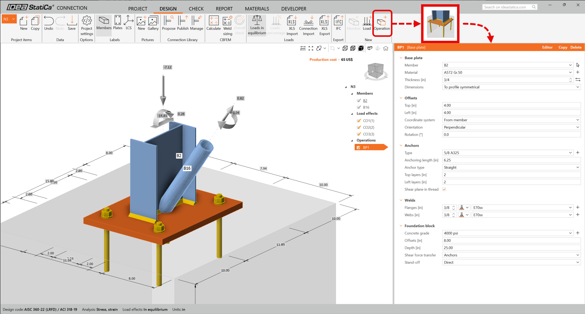 To create the base plate connection, we are going to use the manufacturing operations. On the upper ribbon select Operation, choose the Base plate and Connecting plate operations, and adjust the parameters as shown below: