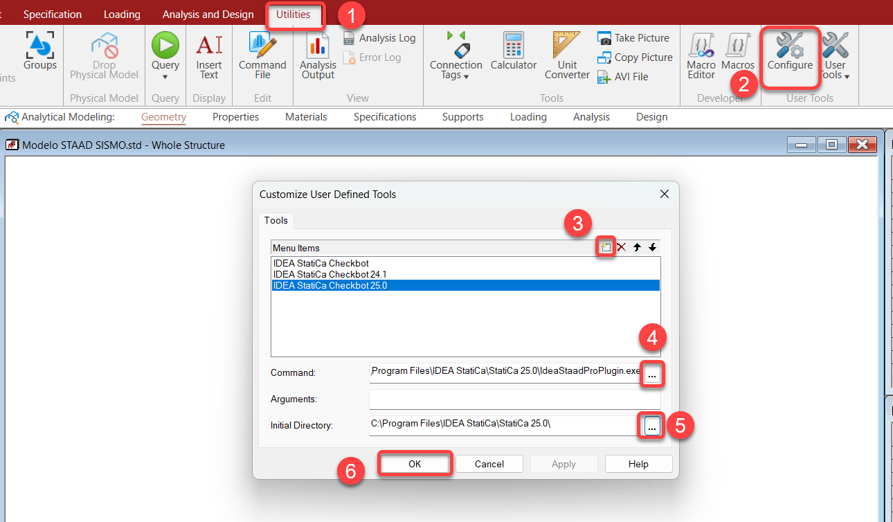 - Check whether the path is set as C:\Program Files\IDEA StatiCa\StatiCa 25.0\IdeaStaadProPlugin.exe (4). This should be done automatically by the software.