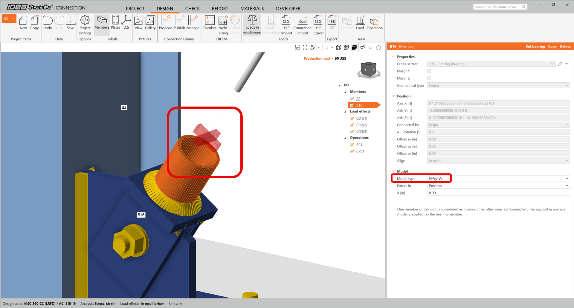 As we have connected the diagonal brace using a single bolt connection, we must also change the Model type of the brace member to N-Vy-Vz. Select the brace in the list of Members and modify the Model type in the drop-down list.