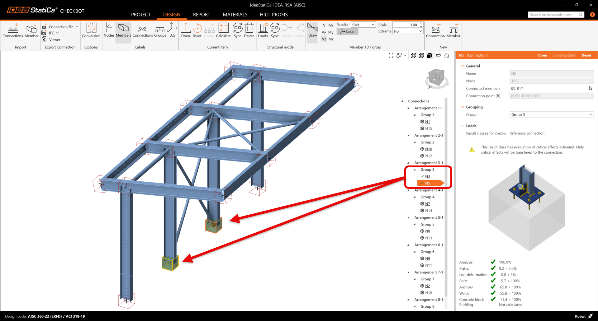 In the example below, you can see that both baseplate connections, under group 3, have passed their respective code-checks while the remaining connections are yet to be validated.