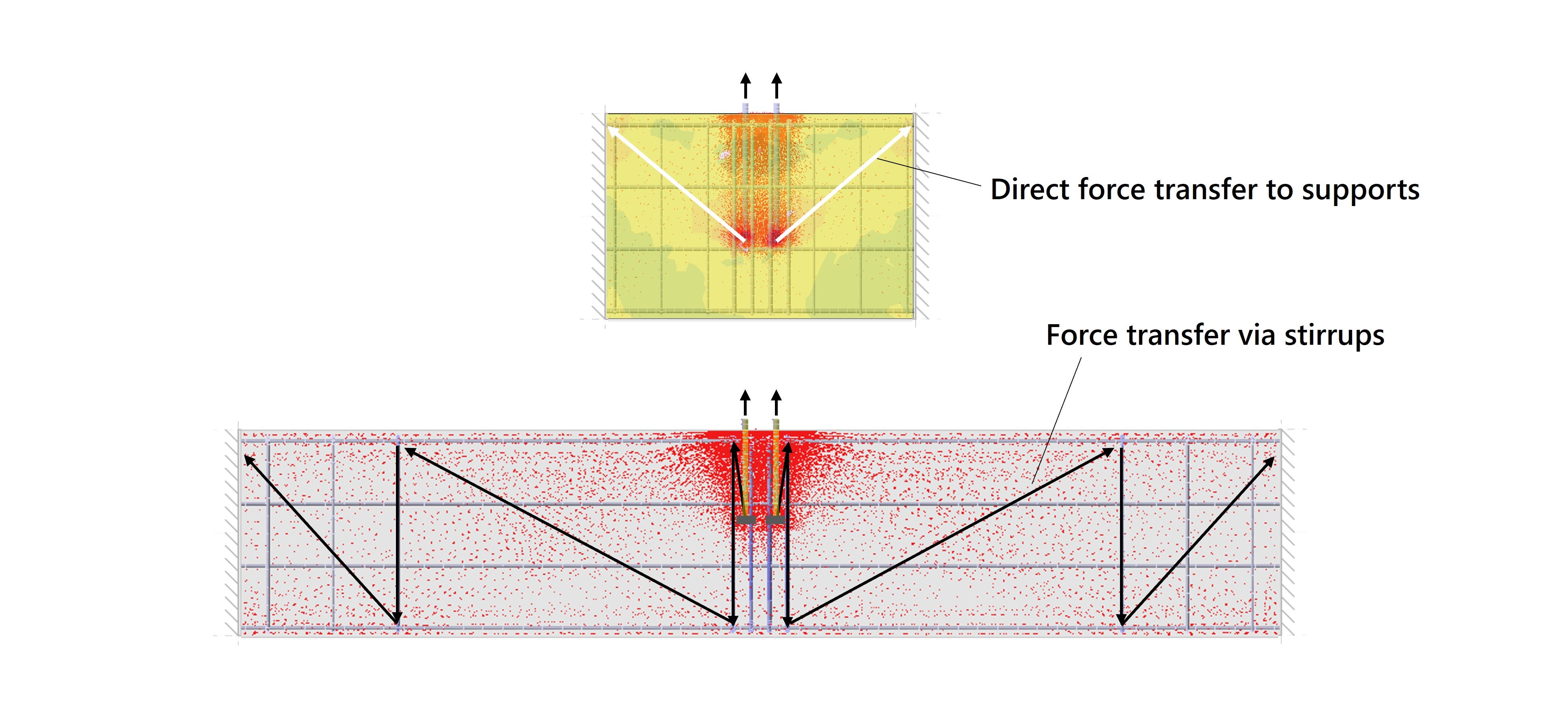 Een deel van de trekkrachten uit de ankers wordt alsnog via een directe drukdiagonaal overgedragen naar de eerste beugels, aangeduid met de witte pijl in Figuur 11. Hoewel dit gedrag gedeeltelijk kan worden beperkt, is het verder verwijderen van beugels niet zinvol, omdat daardoor andere faalmechanismen kunnen optreden, bijvoorbeeld door torsie in de balk.