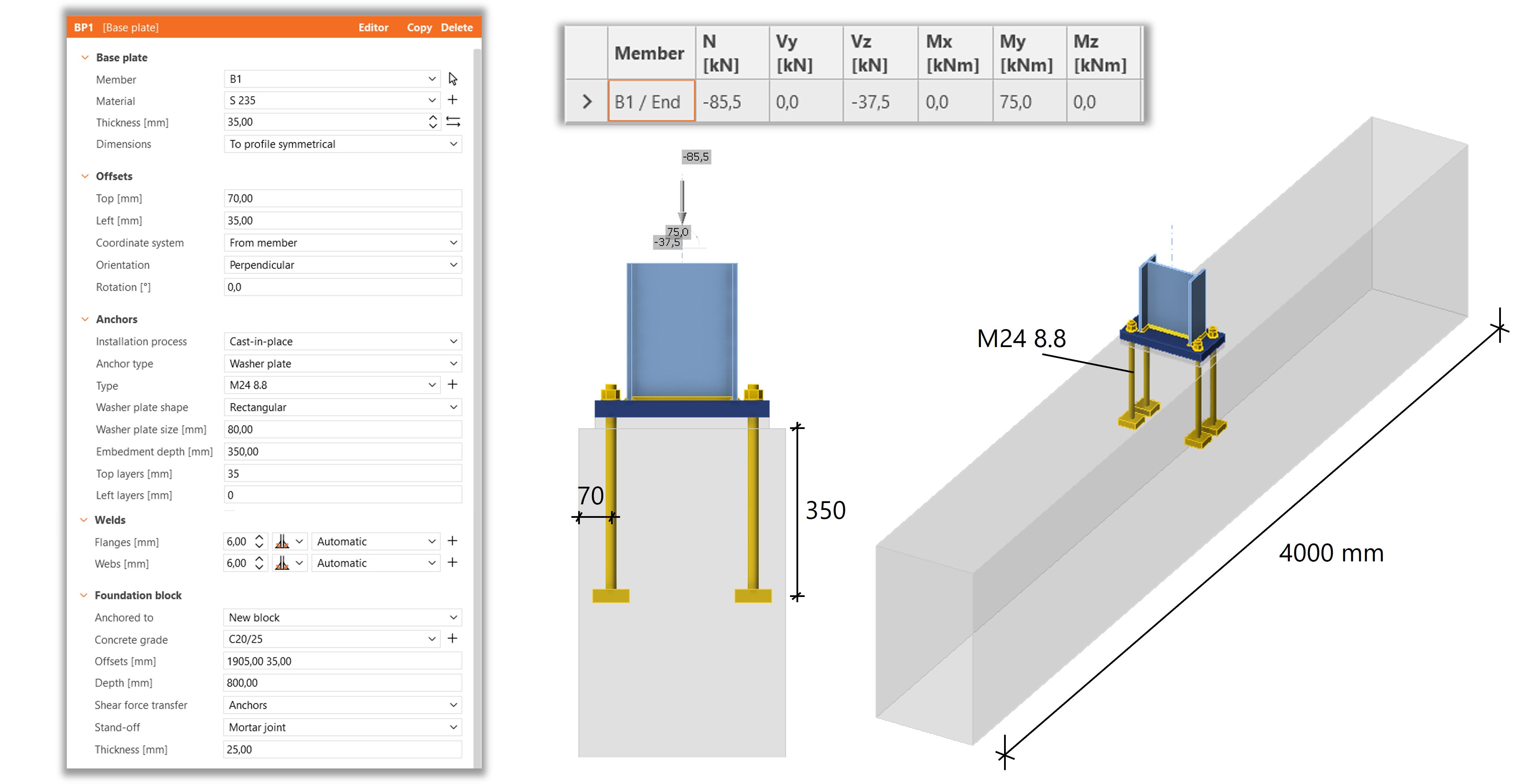 Het model is eerst gemodellerd in de Connection applicatie, waarin het staaldeel, inclusief voetplaat en lassen, op basis van de CBFEM-berekening wordt getoetst. De ankerkrachten en drukspanningen in het beton worden vervolgens gebruikt voor de toetsing van de verankering volgens de geldende normen EN 1992-4, EN 1992-1-1 en EN 1993-1-8, afhankelijk van het type anker en het betreffende faalmechanisme.