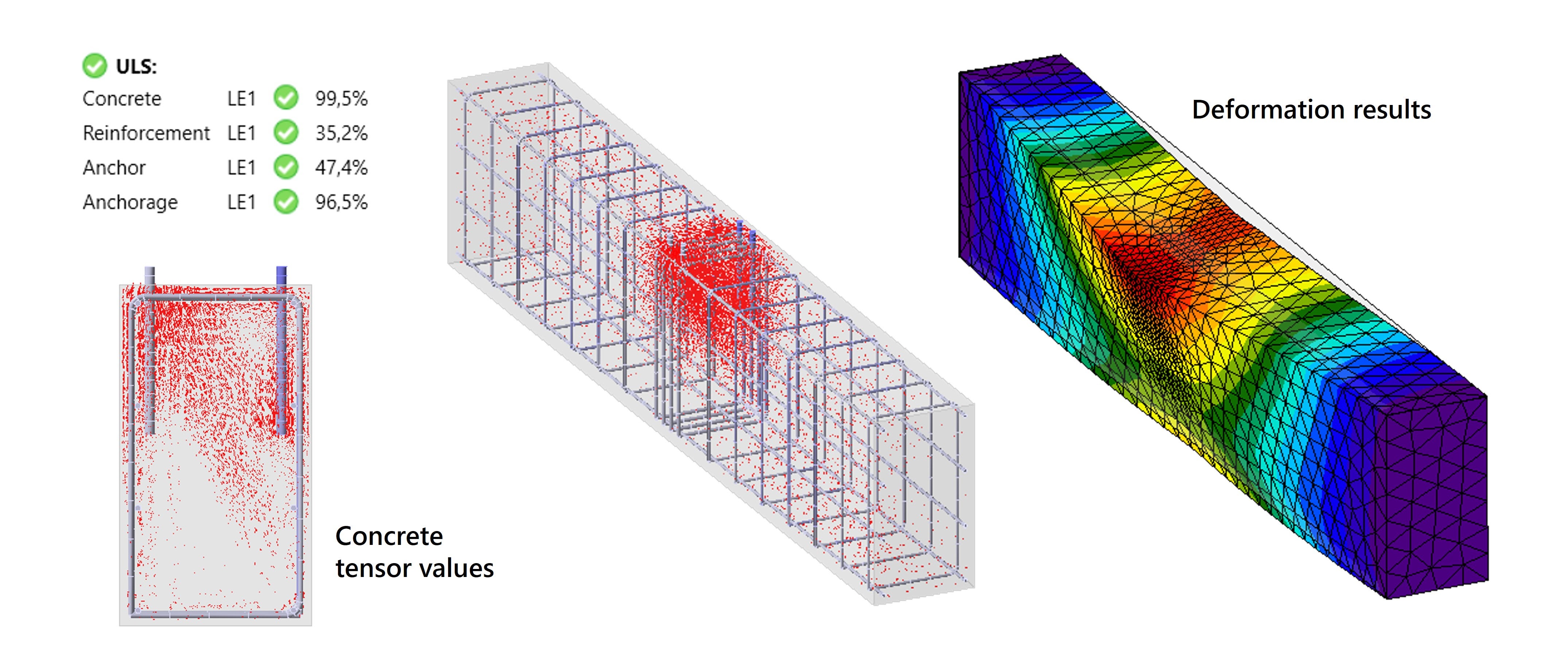 De UGT-toetsingen zijn linksboven weergegeven en voldoen. De spanningen in zowel beton als wapening blijven binnen de ontwerpwaarden, en de ankers en wapening zijn voldoende verankerd. De vervormingen liggen binnen de verwachting en er treden geen ongewenste vervormingen of stabiliteitsproblemen op.