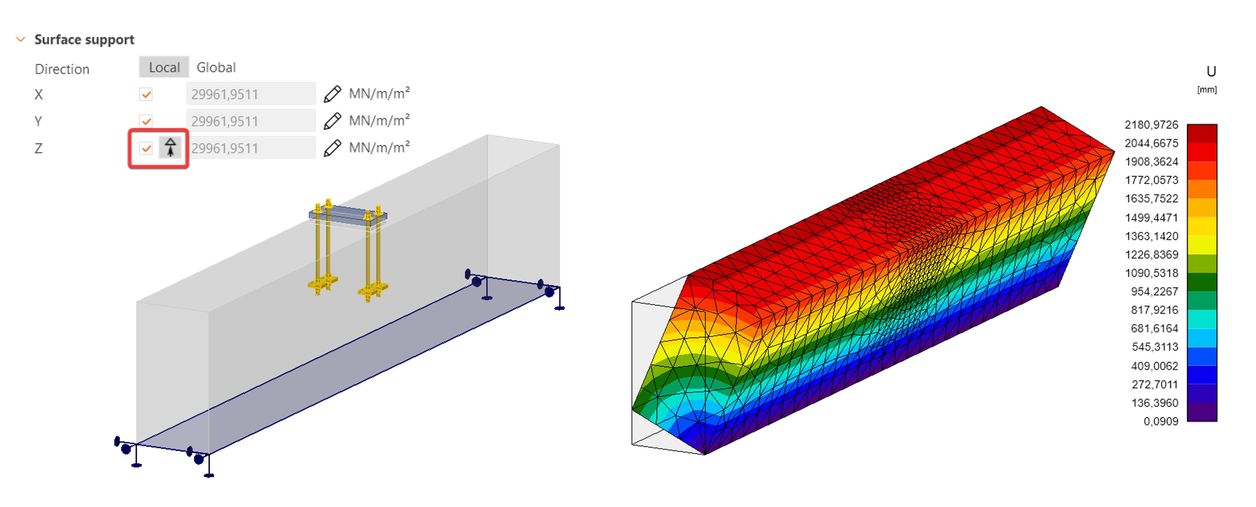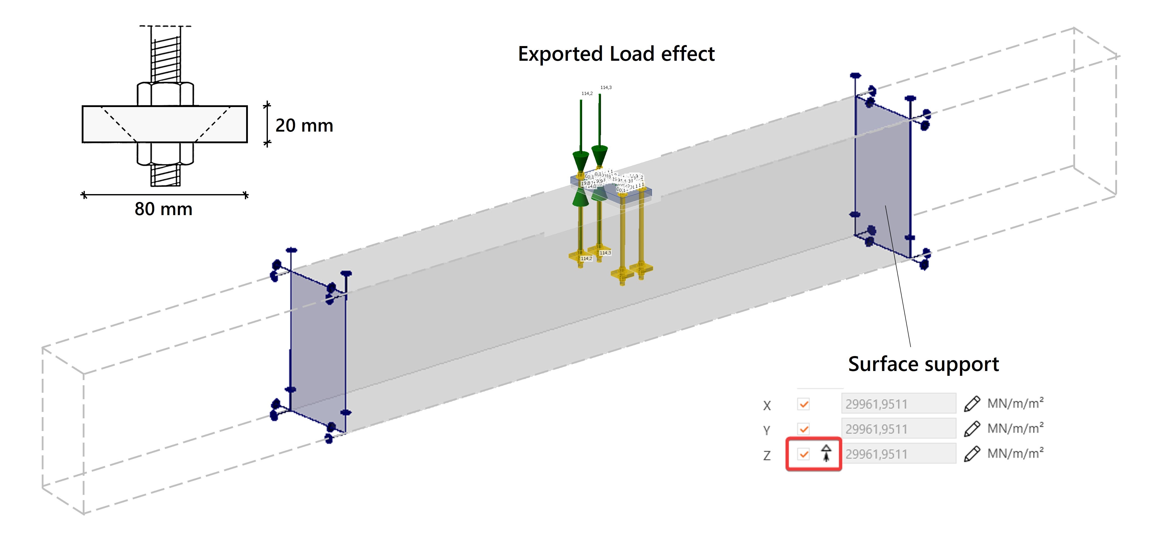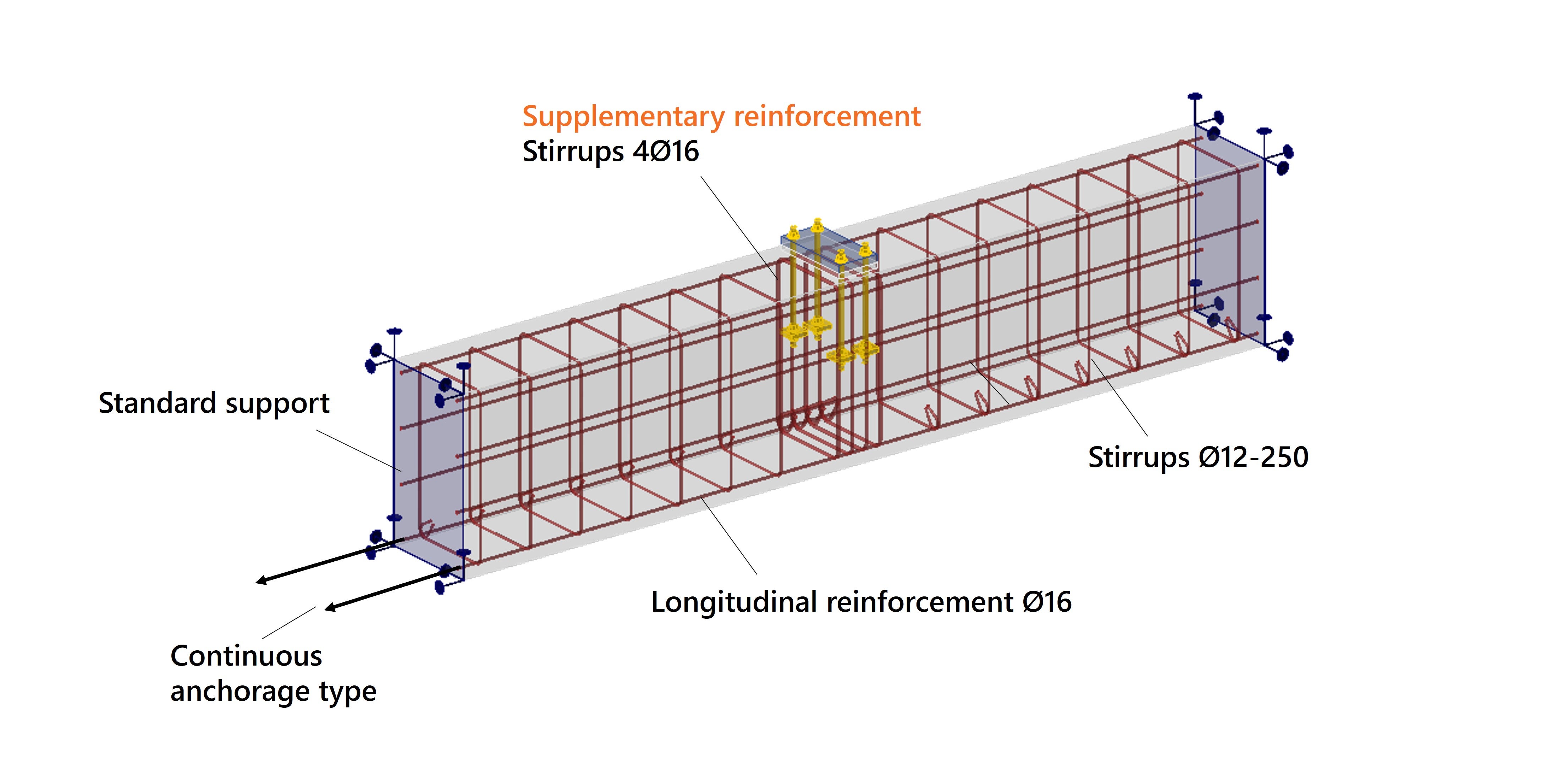 Bij de export wordt automatisch een oppervlakteondersteuning aangemaakt. Deze bevindt zich aan de onderzijde, maar moet worden aangepast zodat aan beide uiteinden van de balk een ondersteuning aanwezig is. Er wordt aangenomen dat de balk in werkelijkheid langer is en hier wordt afgekapt. De langswapening loopt daarbij door de ondersteuning die stijfheid biedt in druk & trek.