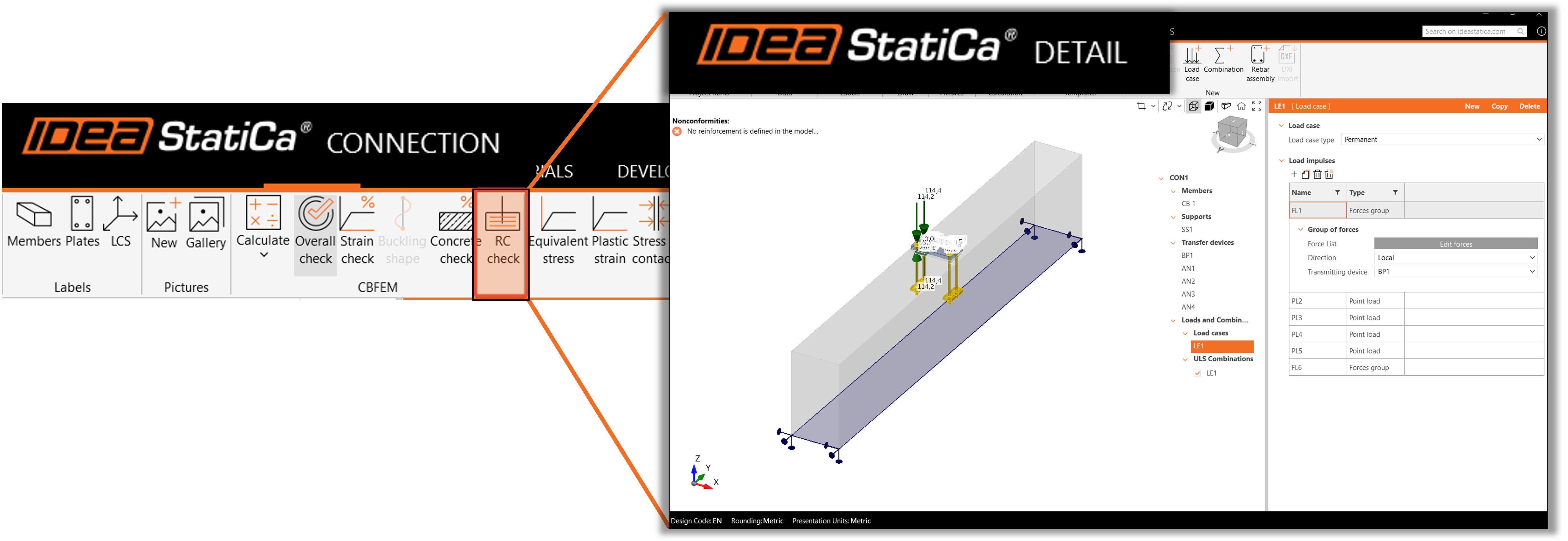 Het Connection model wordt geëxporteerd naar IDEA StatiCa 3D Detail, zodat de wapening expliciet kan worden meegenomen in de analyse en het bezwijken van het beton kan worden voorkomen. Op deze manier worden alle normtoetsingen voor zowel de ankers als het beton volledig afgedekt.