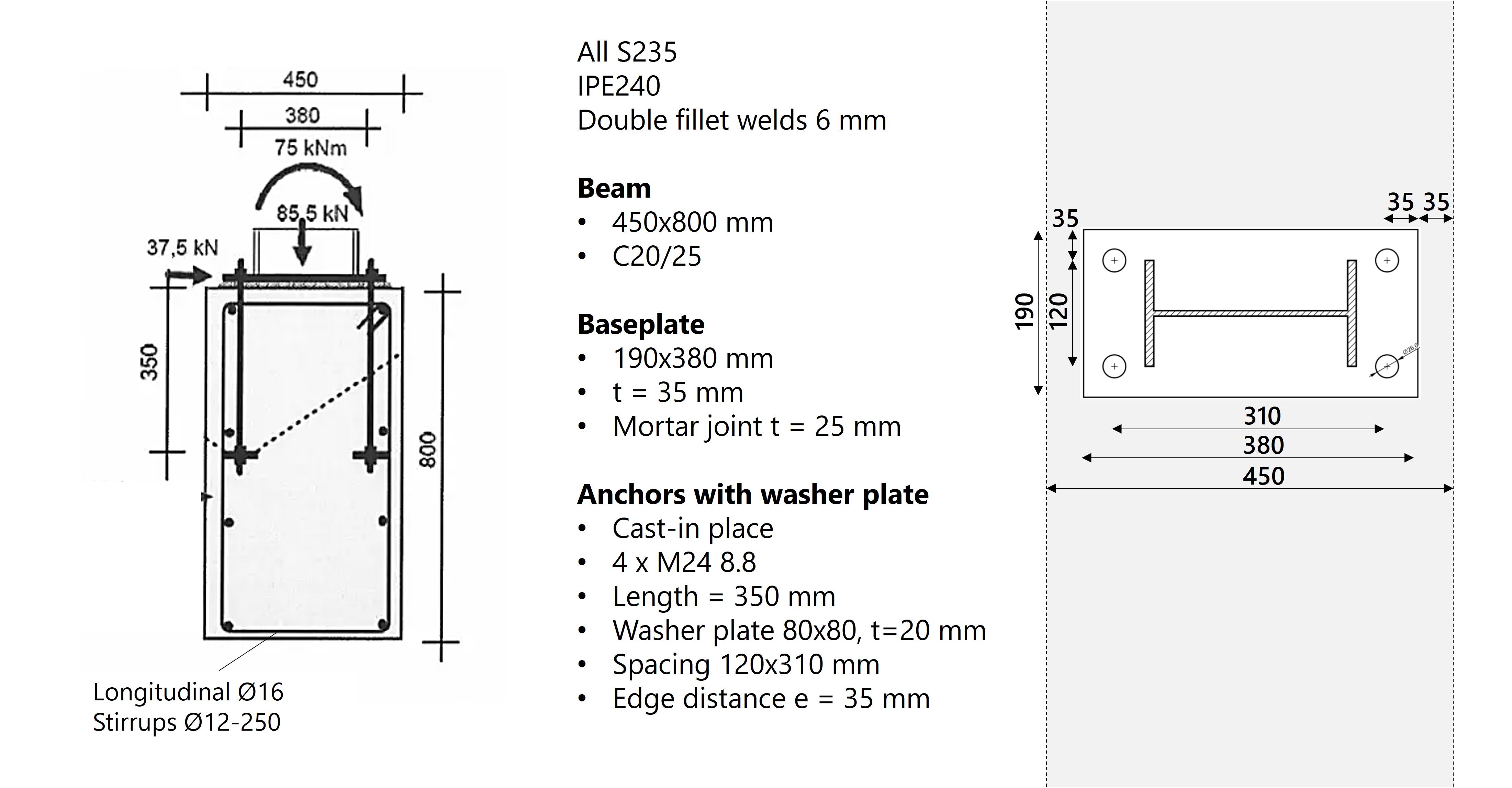 De stalen kolom met doorsnede IPE240 is geplaatst op een smalle funderingsbalk van 450x800 mm2. Op de kolom werken een normaaldrukkracht, een dwarskracht en een buigend moment. In combinatie met de korte randafstanden, zorgt dit voor een uitdagend ontwerp. De opgave bestaat uit het toetsen van de verschillende faalmechanismen en het bepalen van de benodigde wapening om betonkegelbreuk en splijten te voorkomen. Zie hieronder de gegeven informatie.