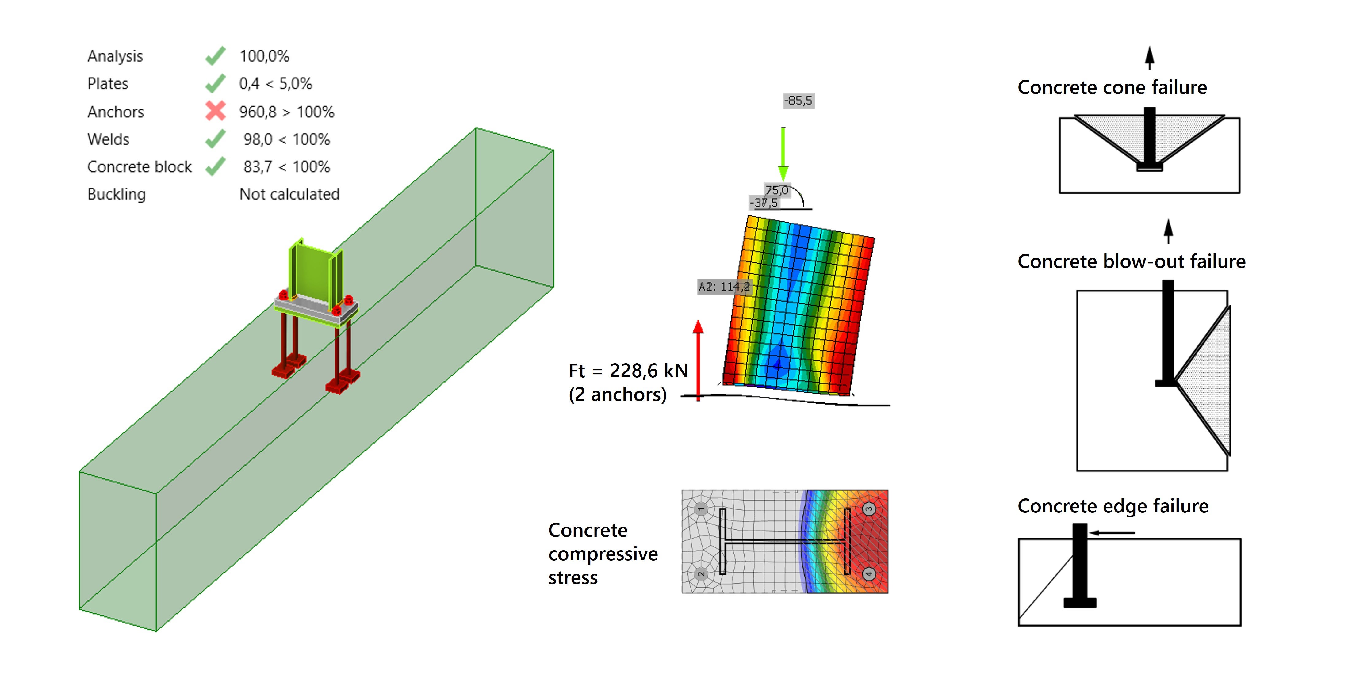 Wanneer we de resultaten nader beschouwen, blijkt dat de toetsing op staalbreuk onder trek en afschuiving, evenals het uittrekken van de ankers, voldoet. De maatgevende controle wordt echter bepaald door het beton, dat bezwijkt volgens drie mechanismen: betonkegelbreuk, zijdelings uitbreken en betonrandbreuk. Dit zijn drie duidelijke faalmechanismen die onvermijdelijk optreden bij een berekening met ongewapend beton en deze combinatie van ankerkrachten en randafstanden.