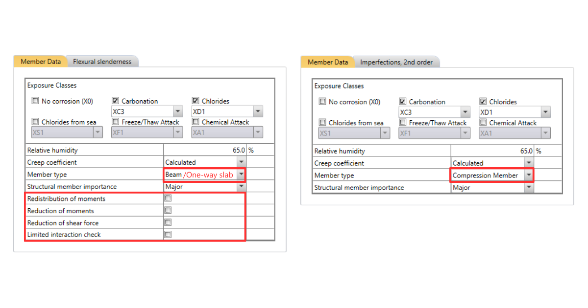 Go to the Navigator -> Design member -> Member Data. You will find a part dedicated to the environment (Exposure Classes, Relative Humidity) and other settings (Creep coefficient and Structural member importance) common for all member types (Beam, One-way slab, Compression Member). The rest of the tab is available only for Beam and One-way slab, and it allows us to tick/untick checkboxes for the reductions and redistribution. See the detailed picture below.
