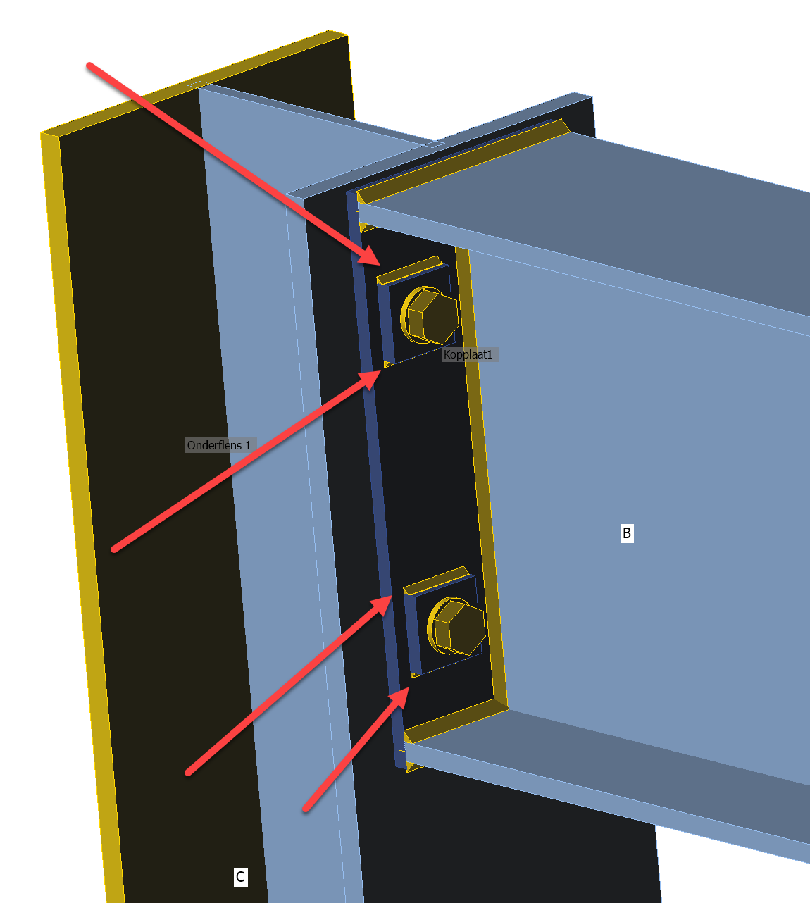 Deze plaatjes zullen in de praktijk nergens naartoe gaan, maar IDEA kan dit niet berekenen omdat de plaatjes rond kunnen draaien rond de bout en bij een las aan 1 zijde van het tussenplaatje om kunnen klappen.