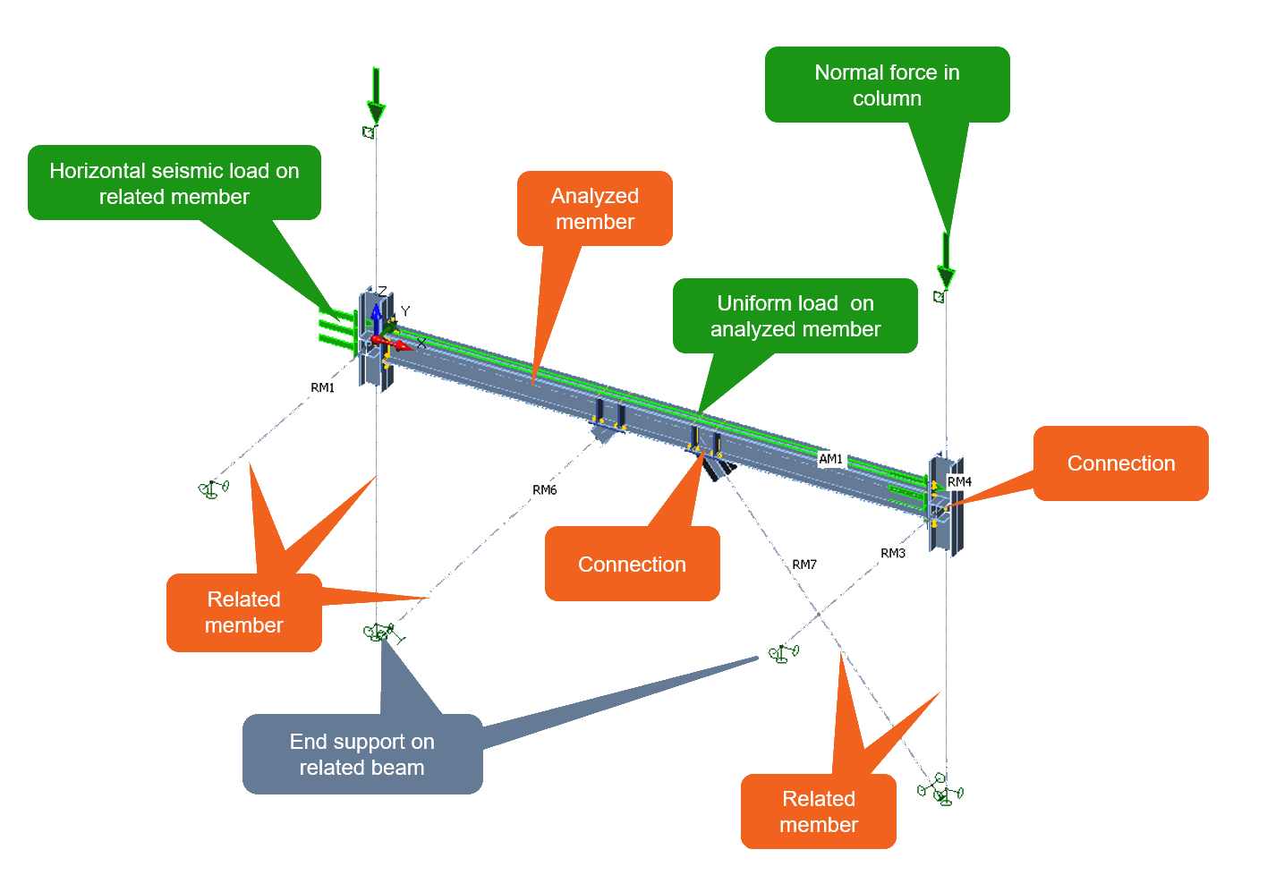Analyzed member is a part of the structure which is meant to be analyzed, the part in which we are interested in. Related members are all other members that are connected to the analyzed one. Related members have common joints with the analyzed one.