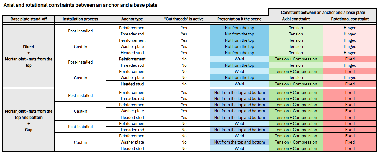 Hieronder vindt u een samenvattende tabel die de axiale en rotatiebeperkingen tussen de voetplaat en het anker uitlegt.