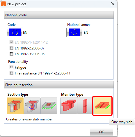 The type is adapted to design the slab members acting in one direction only. The same rules, except the reinforcement templates, as for the 1D reinforced section, apply.