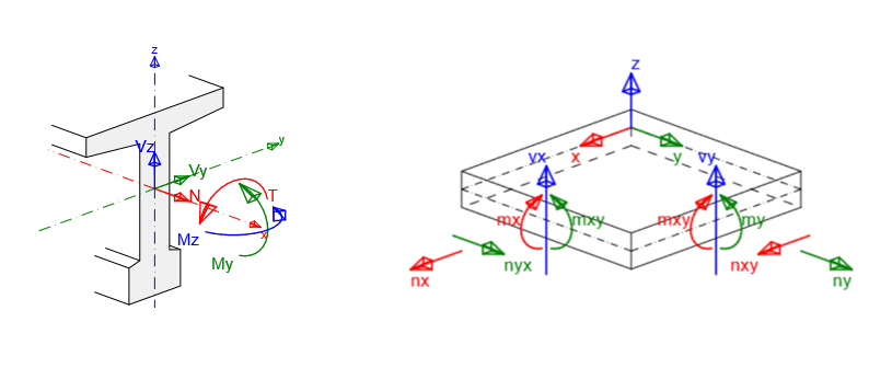 The cross-section can be defined from templates or as a general shape. The reinforcement can be set using pre-defined templates or generally in the reinforcement editor. Loading is handled by a complete set of internal forces.