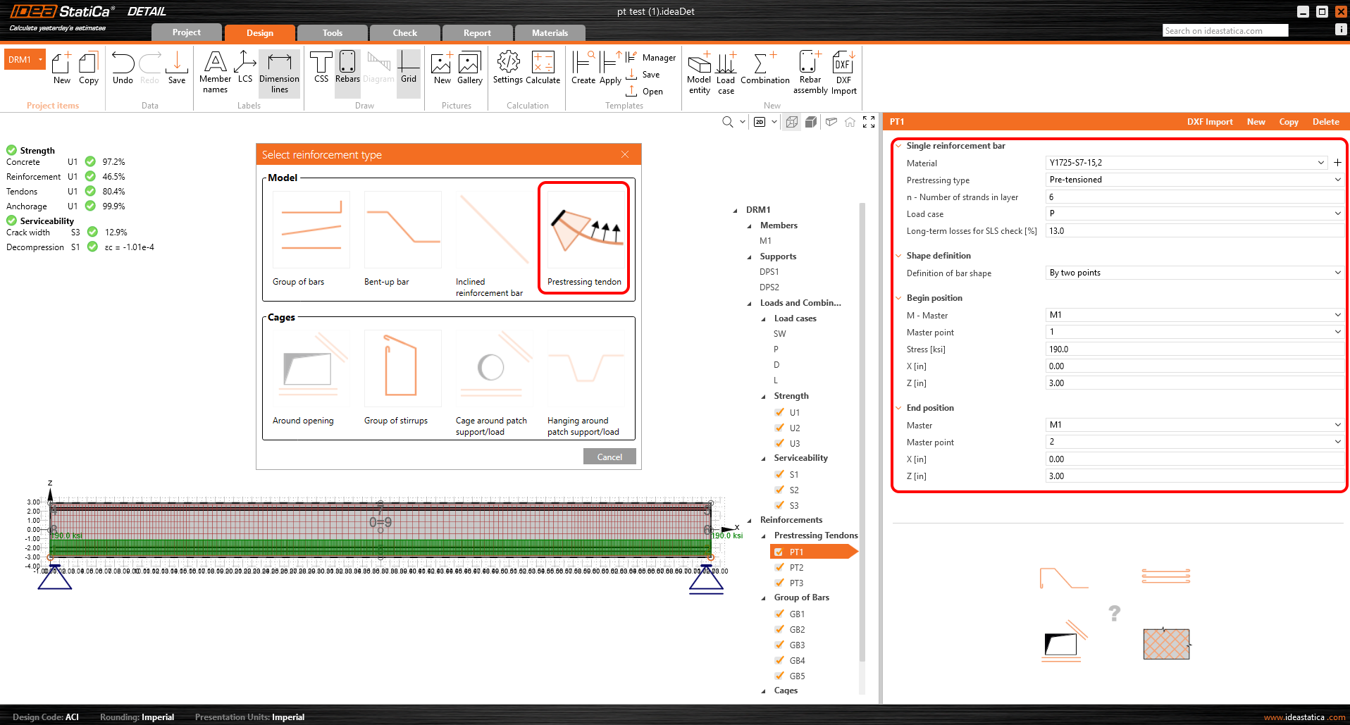 De laag van voorgespannen strengen voor wanden en liggers kan worden gedefinieerd met de coördinaten van twee punten gerelateerd aan het masterpunt. Om de voorspanningsintensiteit van de kabel te bepalen, moet de spanning in de voorspanningswapening vlak voor het loskomen van de landhoofden, na kortetermijnverliezen zoals verankering, vervorming van het landhoofd en kortetermijnontspanning, worden opgegeven.