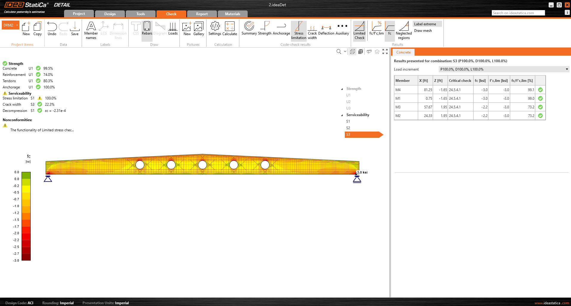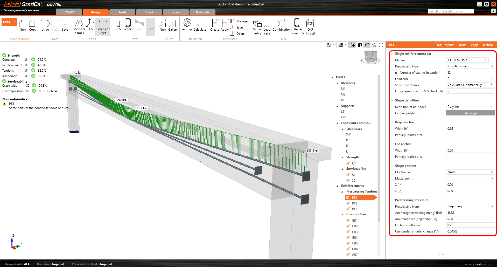 De functies omvatten invoer voor voor- en nagespannen beton, een database met voorspankabels en uitgebreide controles volgens de ACI-code. De toepassing bevat een database van voorspanstaal, de mogelijkheid om gedeeltelijk belaste gebieden in te voeren en te evalueren en alle vereiste ACI standaardcontroles, inclusief spanningsbeperkingen en decompressiecontroles.