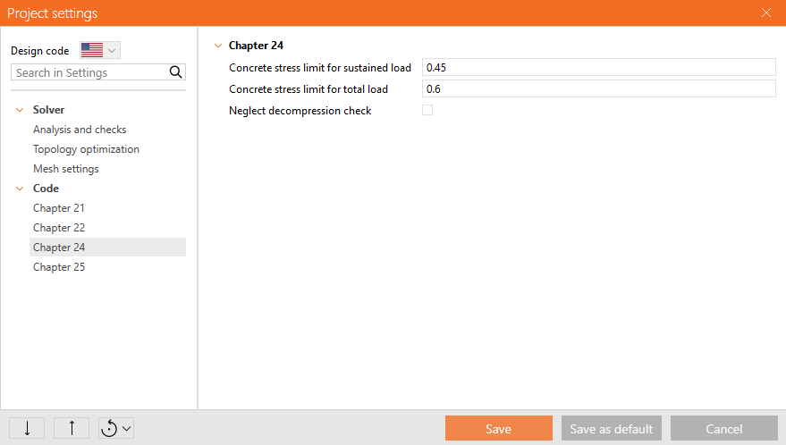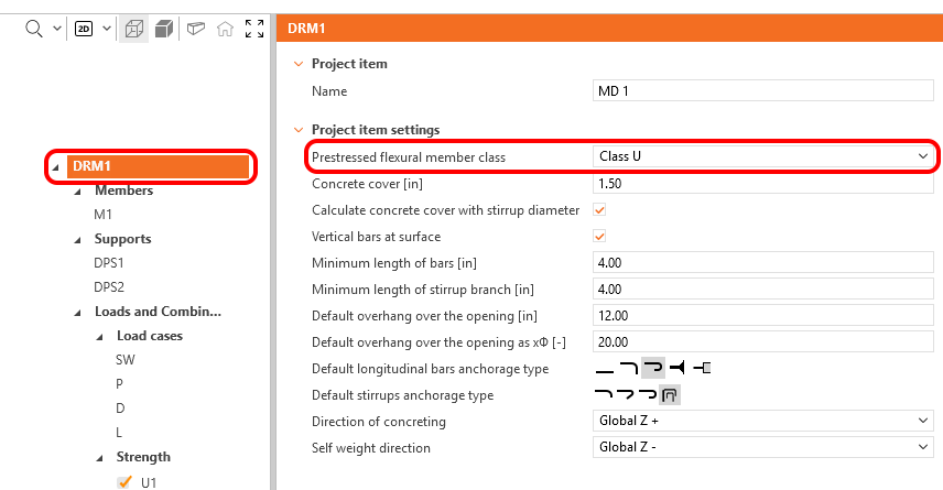 De toepassing bevat spanningsbeperkingscontroles voor beton in voorgespannen elementen. Gebruikers beginnen met het selecteren van de klasse van het voorgespannen element. Voor de klassen U en T worden de bruikbaarheidsspanningslimieten geverifieerd volgens ACI 318-19 paragraaf 24.5.4.1.