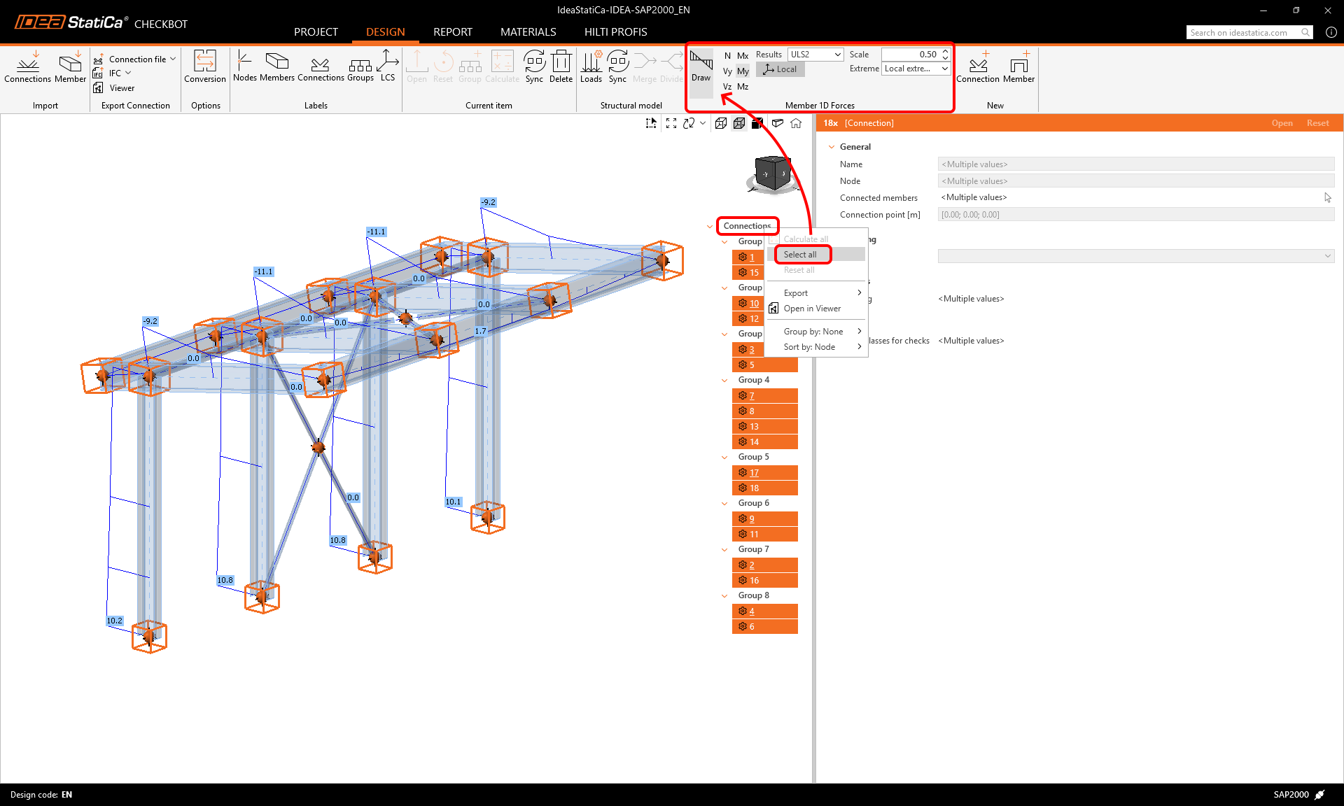 Checkbot also visualizes the internal forces of imported combinations. Right-click connections/members or choose all of them and select the load combinations and internal forces to be displayed.