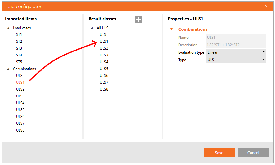 Imported load effects can be re-assigned manually to Result classes. Result classes are meant to sort load effects to specific groups, which can simplify and speed up the design process. Result classes can be added using the "+" icon and removed with a right-click of the mouse. Load cases and combinations can be assigned under a result class by dragging them from the first column under the appropriate result class in the second column.