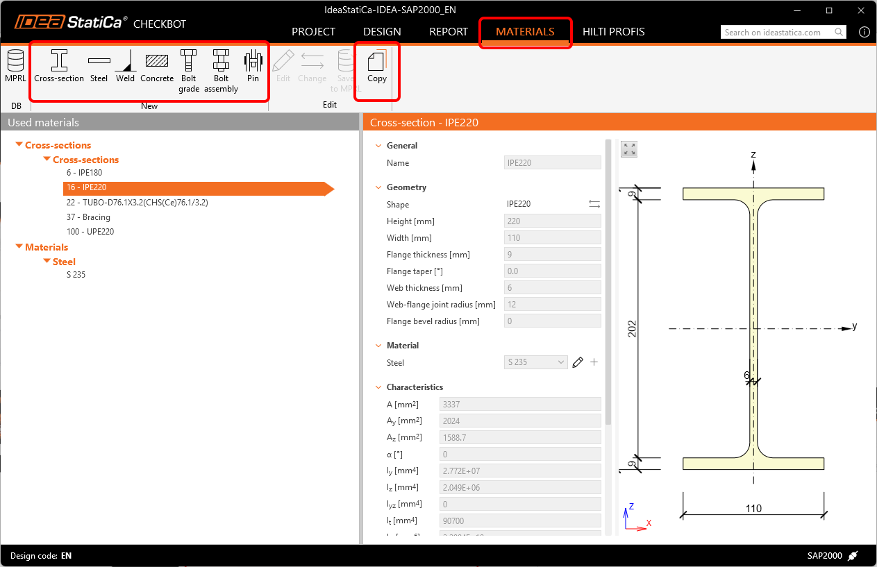 All materials used in Checkbot are listed in the Materials tab. All imported materials and cross-sections are disabled from making any changes. To modify their parameters, a copy needs to be created or completely new material added.