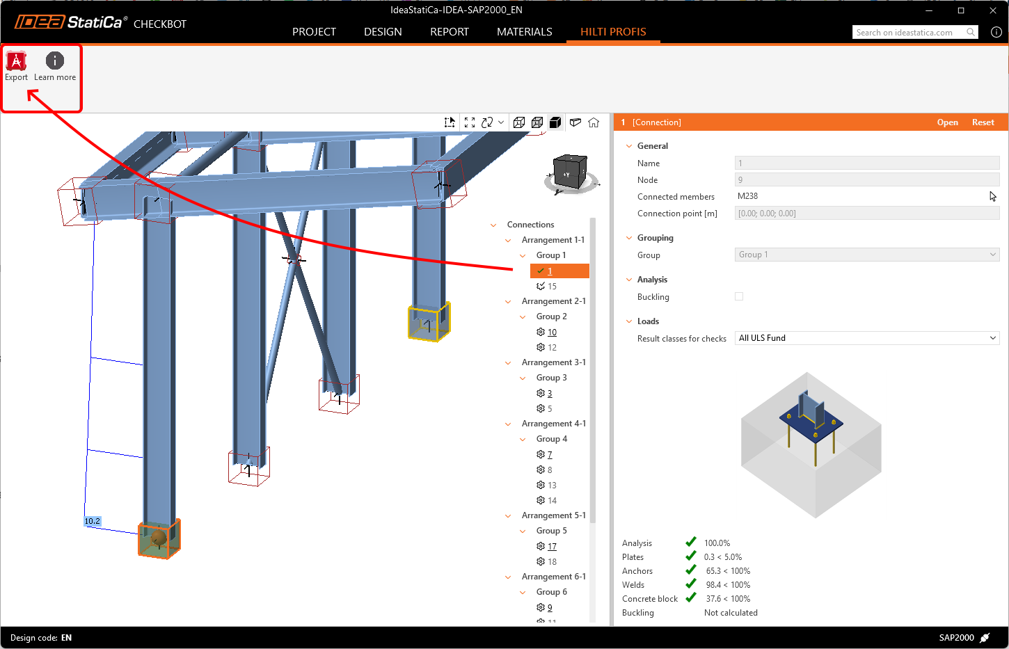 Hilti PROFIS Engineering Suite is a user-friendly, cloud-based software for designing and analyzing anchors. By selecting a node with one anchored member, users can export the data directly to Hilti PE using the Export button, ensuring the accurate transfer of relevant structural data for further analysis.