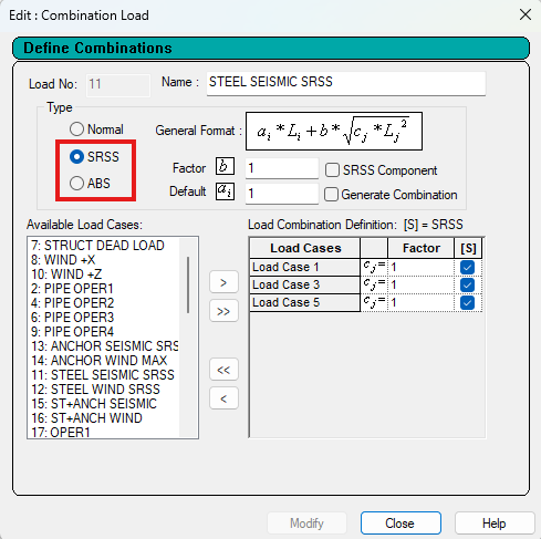 Limitation: SRSS and ABS load combination types are not supported. These special combination methods require non-algebraic mathematical processing.