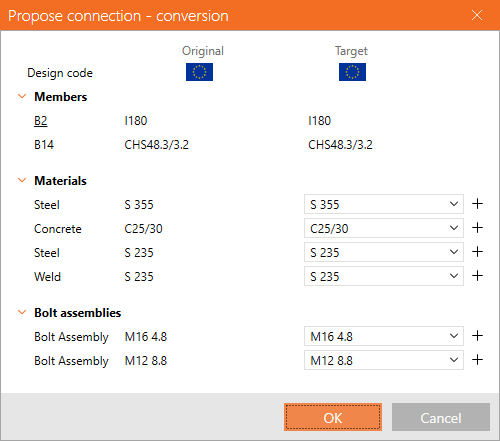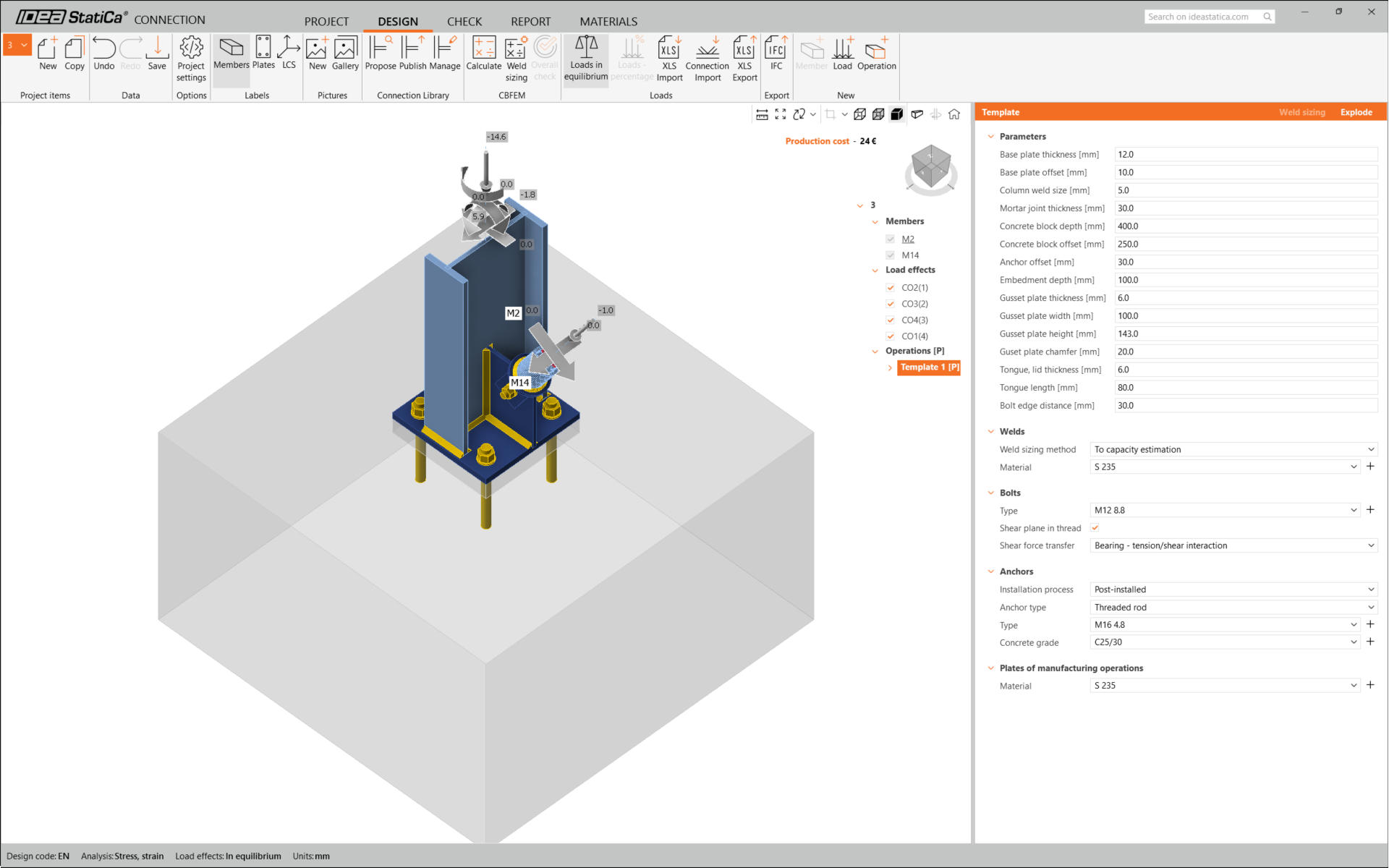 Connection Library shows you the possible solutions for the current geometry. Choose the template Column I base plate 4 bolts diagonal bolted weak and press OK.