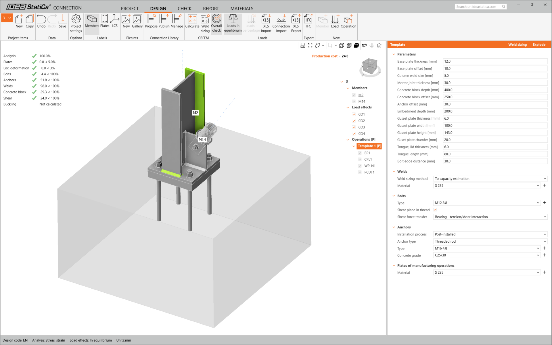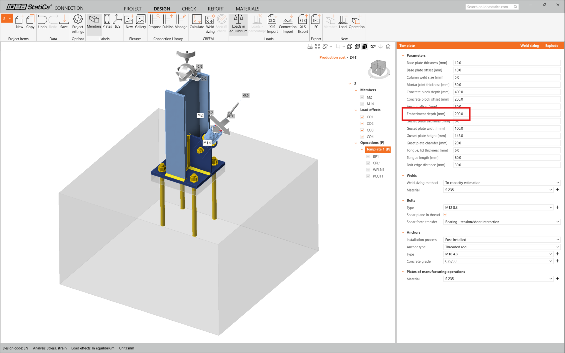 We must optimize the design to find the passing solution. Go back to the Design tab, click on the operation, and change the Anchoring length to 200 mm. Then run the analysis and code-check again.