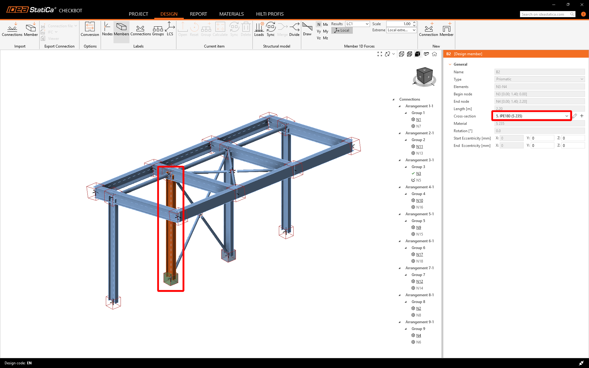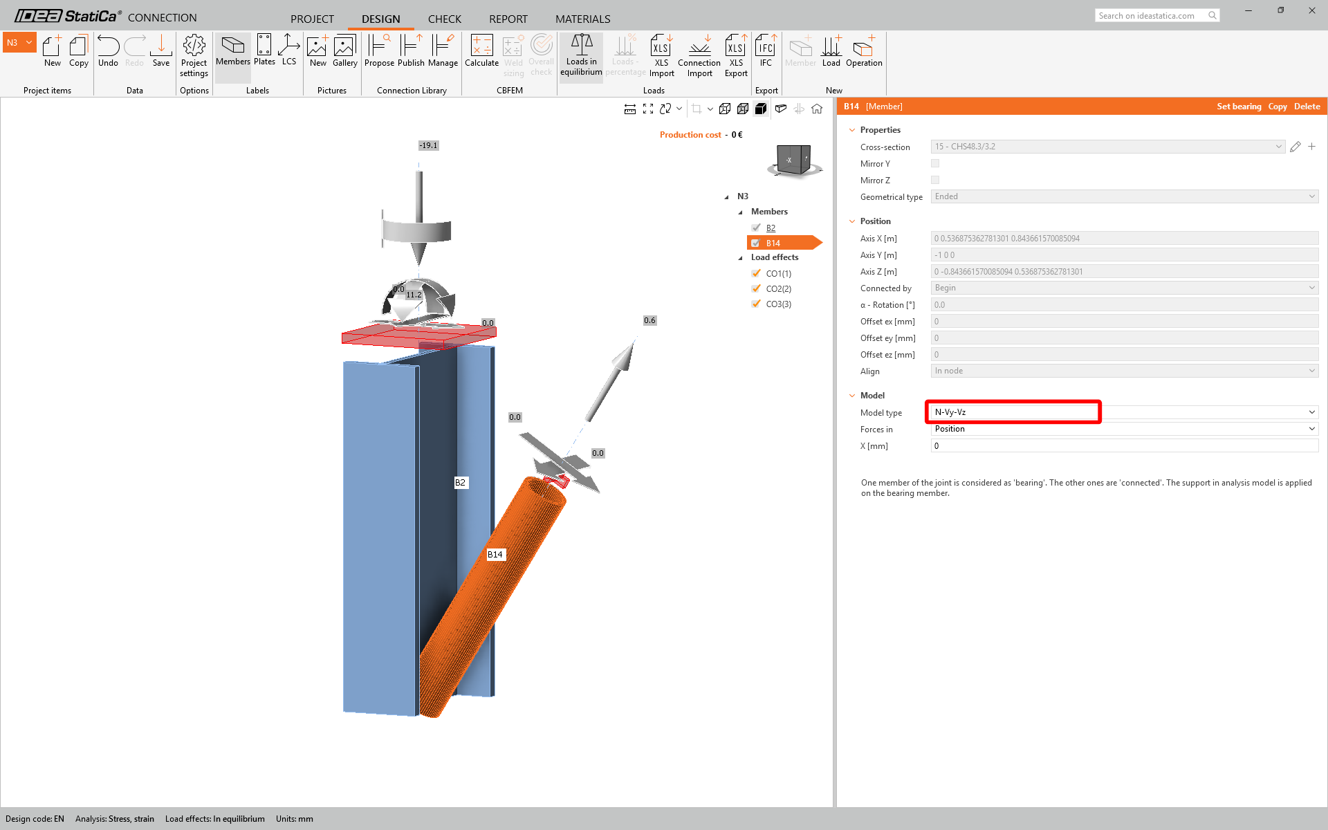 We are going to be using a single bolt connection for the diagonal brace. For this type of connection, we must also change the Model type of the brace member to N-Vy-Vz. Select the brace in the list of Members and modify the Model type in the drop-down list.