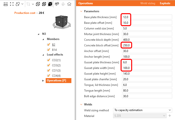 Edit the parameters of this template to fit the desired design – Base plate thickness to 12 mm, Base plate offset to 10 mm, Concrete block offset to 250 mm, Gusset plate thickness to 6 mm, and Gusset plate width to 100 mm.