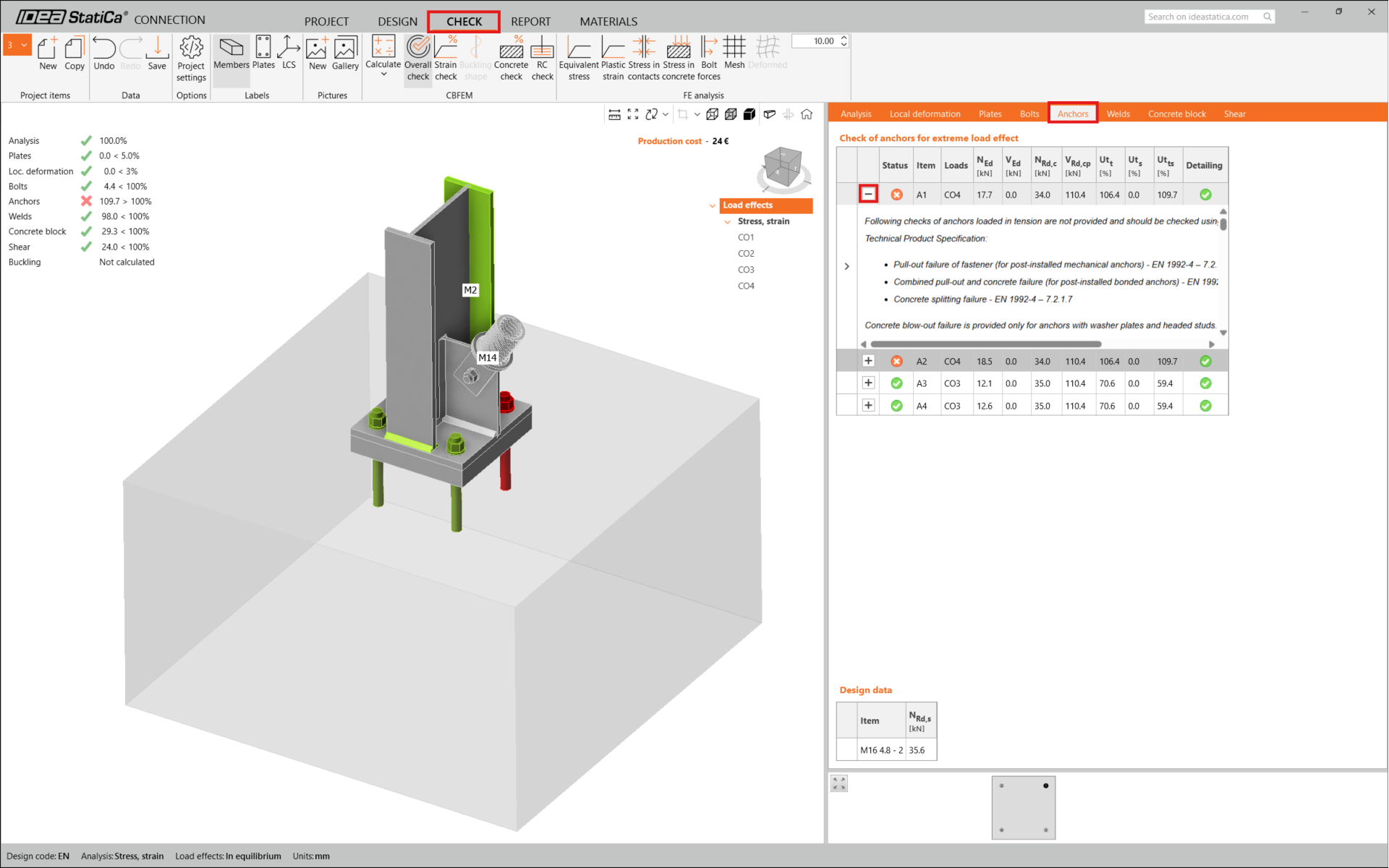 You can go to the Check tab to review the results and take a closer look at the anchors by expanding the calculation using the '+' symbol.  You can see that the anchors are failing in tension in the concrete block.