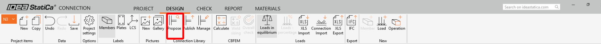 We are going to use the Connection Library to generate a connection. Select Propose and IDEA StatiCa will put forward possible solutions for the current geometry.