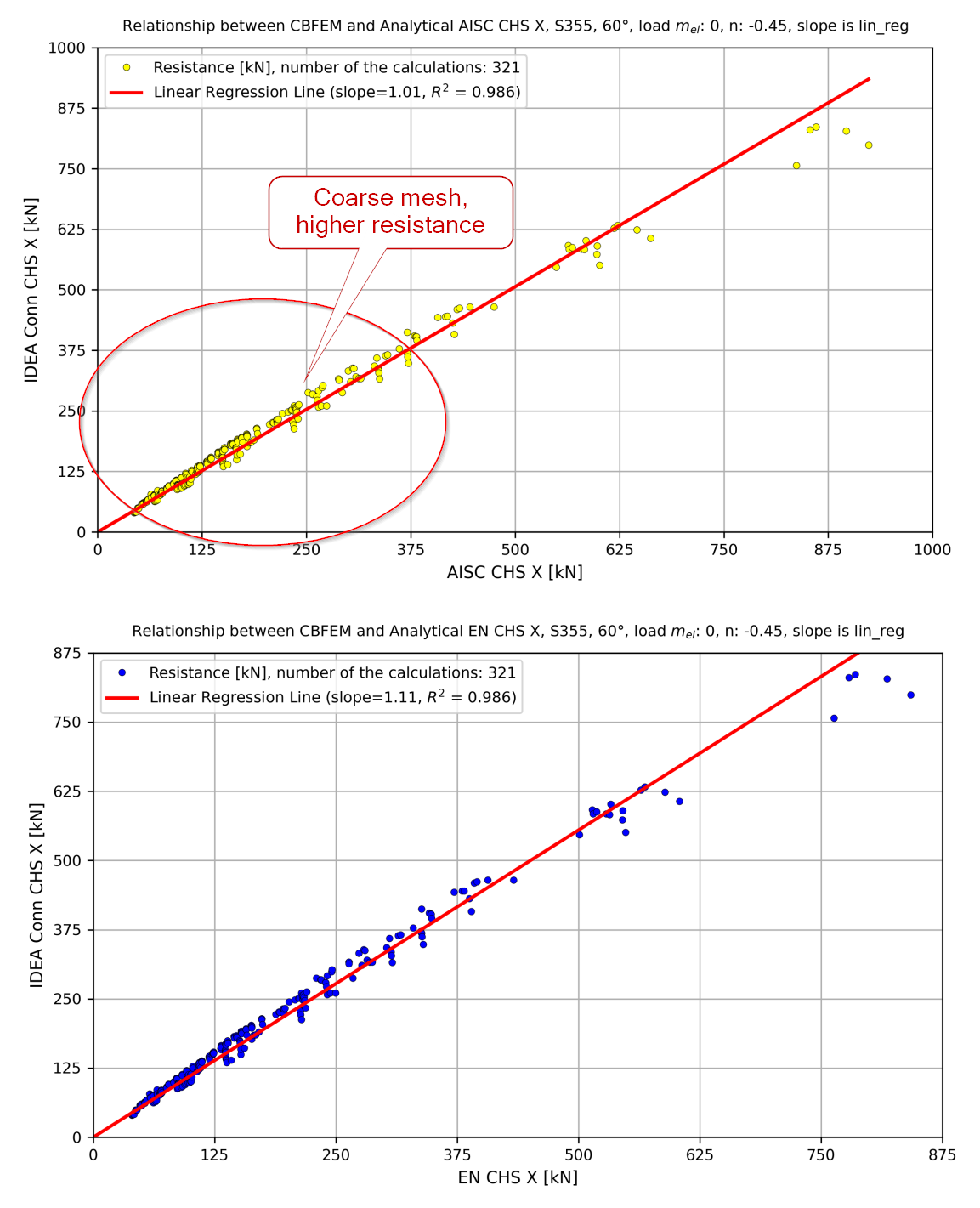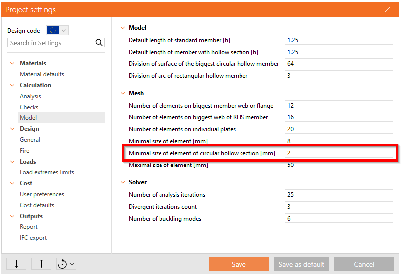The calculation model for circular hollow sections (CHS) is refined to improve numerical accuracy and result consistency. The setting for the minimal finite element size is available in Project settings, allowing users to enforce square meshing, even for small tube diameters (D < 160 mm).