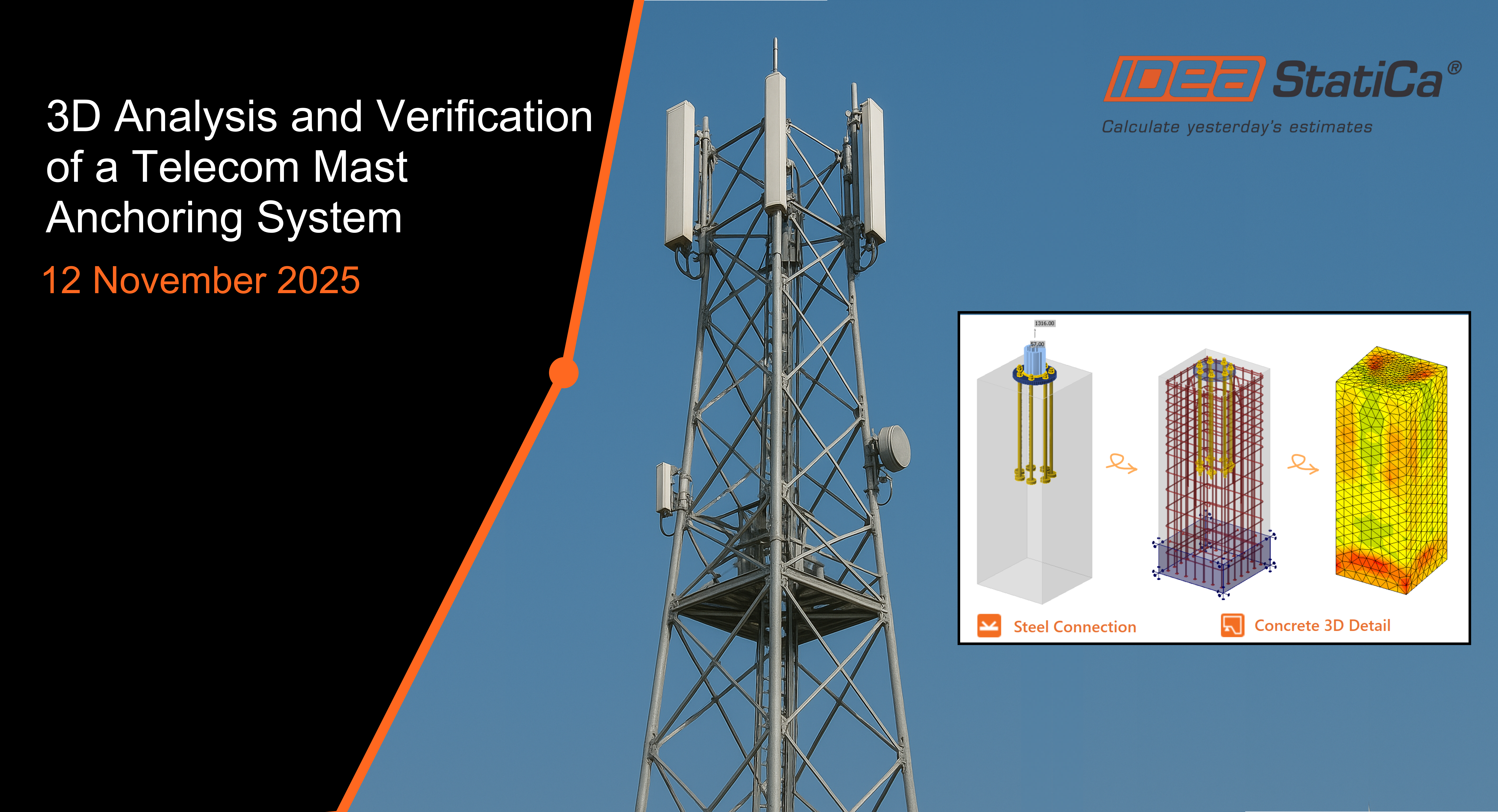 For some time now, it has been possible to model and assess the anchoring of steel beams/columns to a concrete block in IDEA StatiCa Connection. However, due to the lack of information on some types of anchors and the fact that reinforcement in the concrete block cannot be taken into account, some failure modes could not be fully assessed. To eliminate these deficiencies, it is now possible to export the model from Connection to Detail. This involves transferring the geometry and parameters of the concrete block, baseplate and anchors including the applied load. In Detail, it is then possible to model the reinforcement into the concrete block and perform a non-linear finite element calculation (3D CSFM). In this webinar we will show step by step how the workflow was applied for the verification of the anchoring design of the telecom mast tower project.