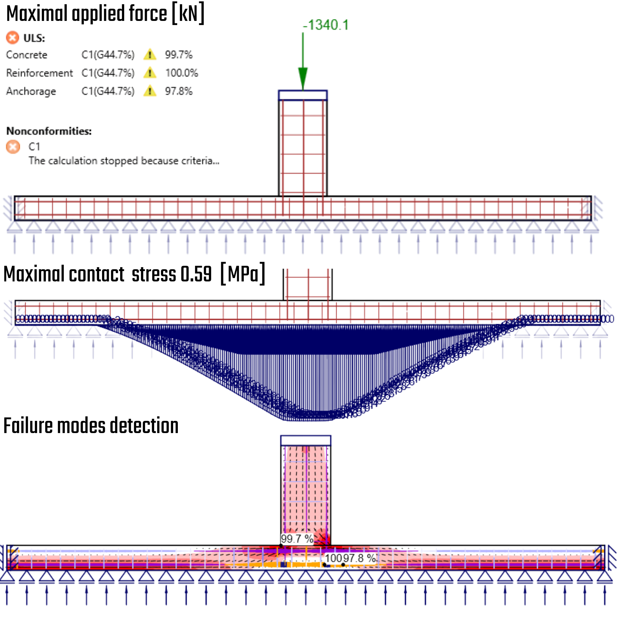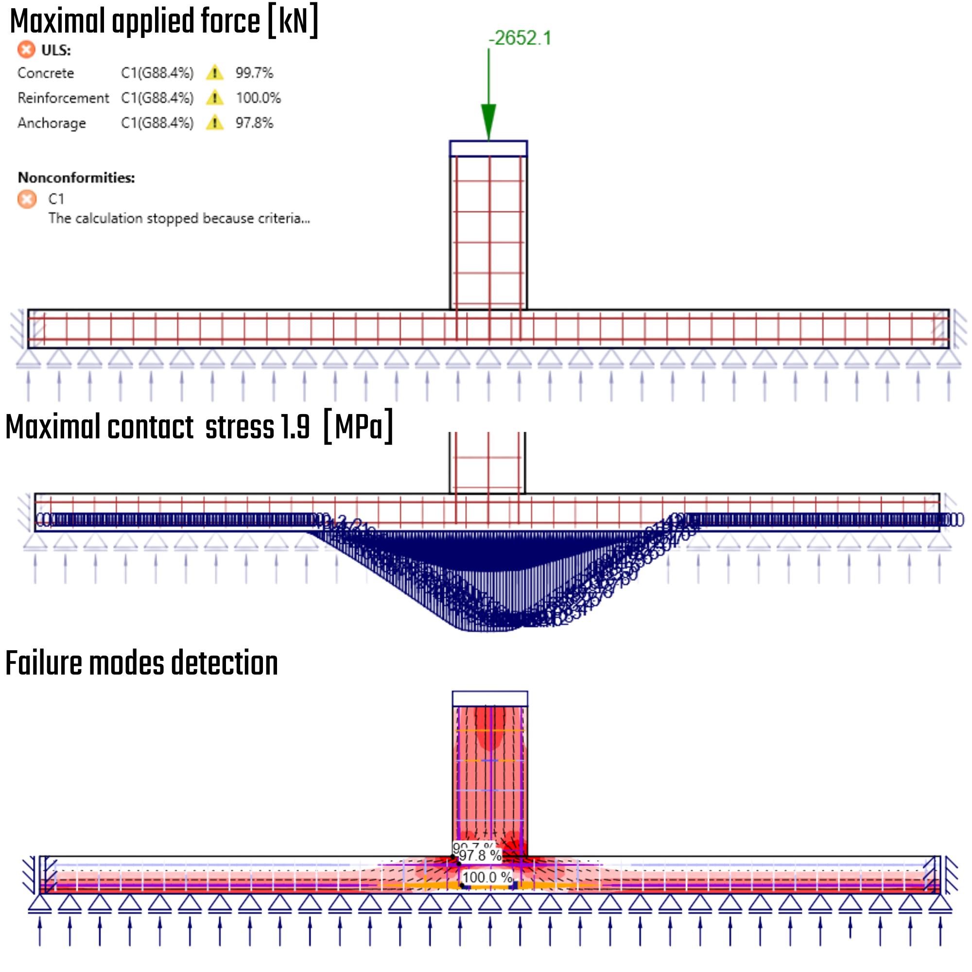 The maximum applied force capable of addressing the failure modes has reached -1340 kN. The vertical force has resulted in a contact stress of 0.59 MPa. The observed trend in contact stress indicates nonlinearity in tension, attributable to the uplift of the left and right sections near the symmetry constraints. The failure modes occurred in compression at the interface between the column edge and the face in contact with the footing. Concurrently, by the tensile rupture of longitudinal reinforcement.