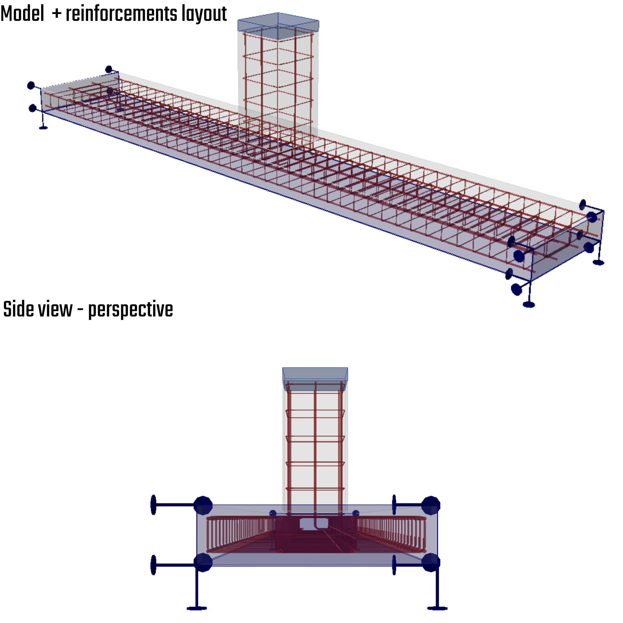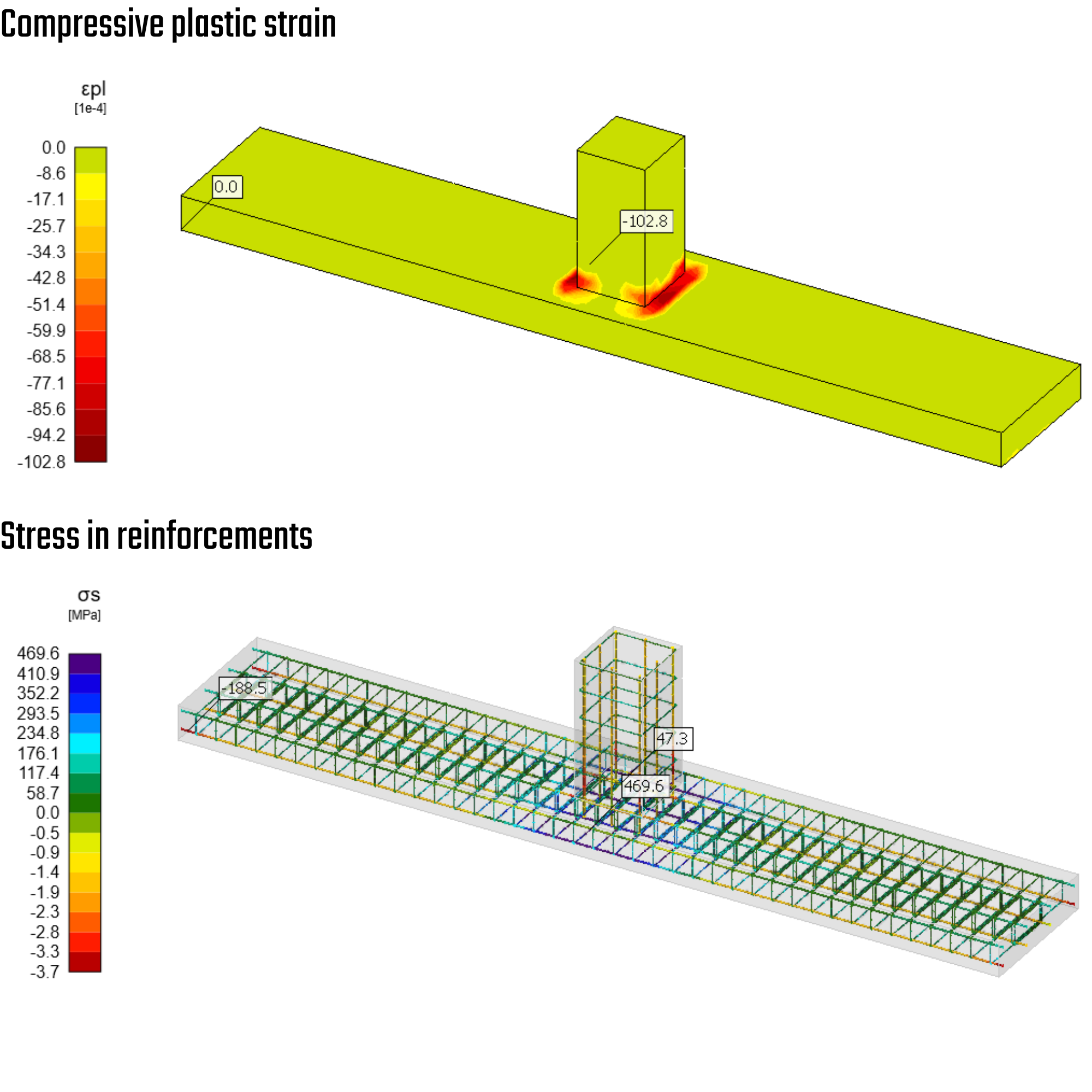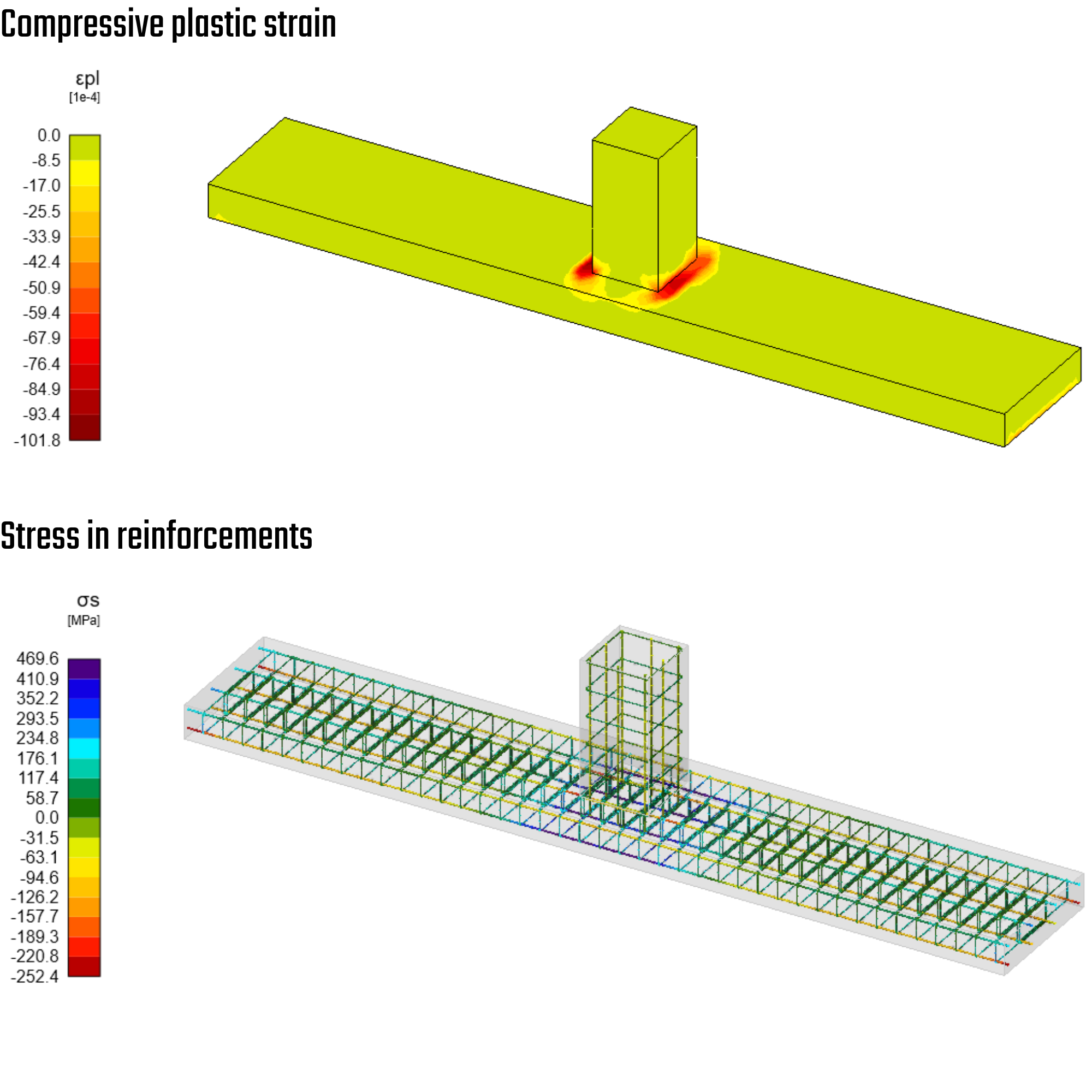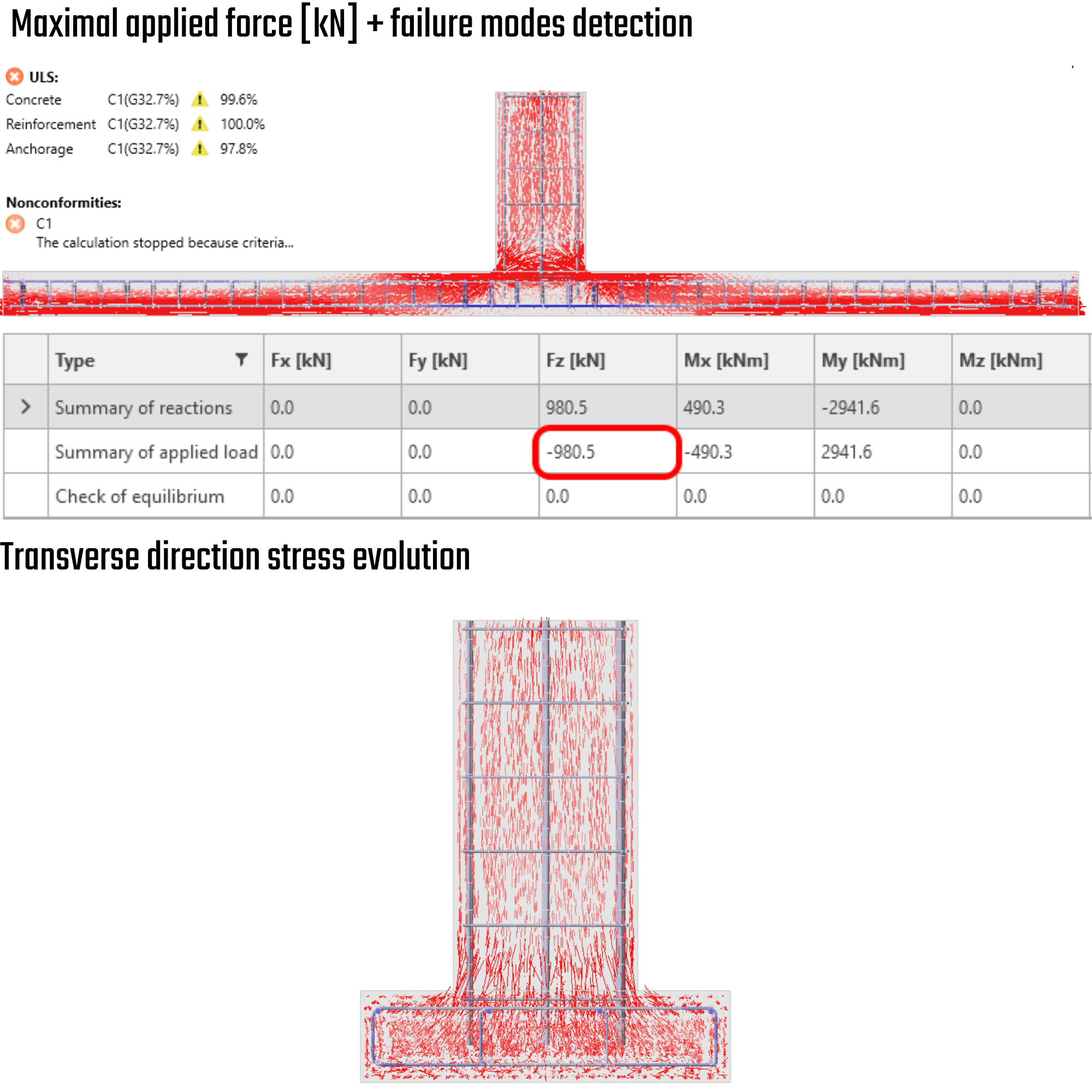 The maximum axial force designated in the model reached -980 kN due to failure modes involving tensile rupture of the longitudinal reinforcement in the encircling area of the column. Transverse compression forces are restrained by the stirrups, which in the column zone are utilized during yielding and contribute to additional failure mode of the horizontal stirrup legs caused by transverse tensile stress evolutions that cannot be captured in the plane stress solution. Over-compression and crushing of the concrete occur at the interface area between the column and footing. The confinement effect is localized in this region, based on the reinforcement effect and the stiffness of the footing strip. The failure mechanism involves concrete crushing, tensile rupture of the longitudinal reinforcement, and the horizontal legs of the stirrups in tension.