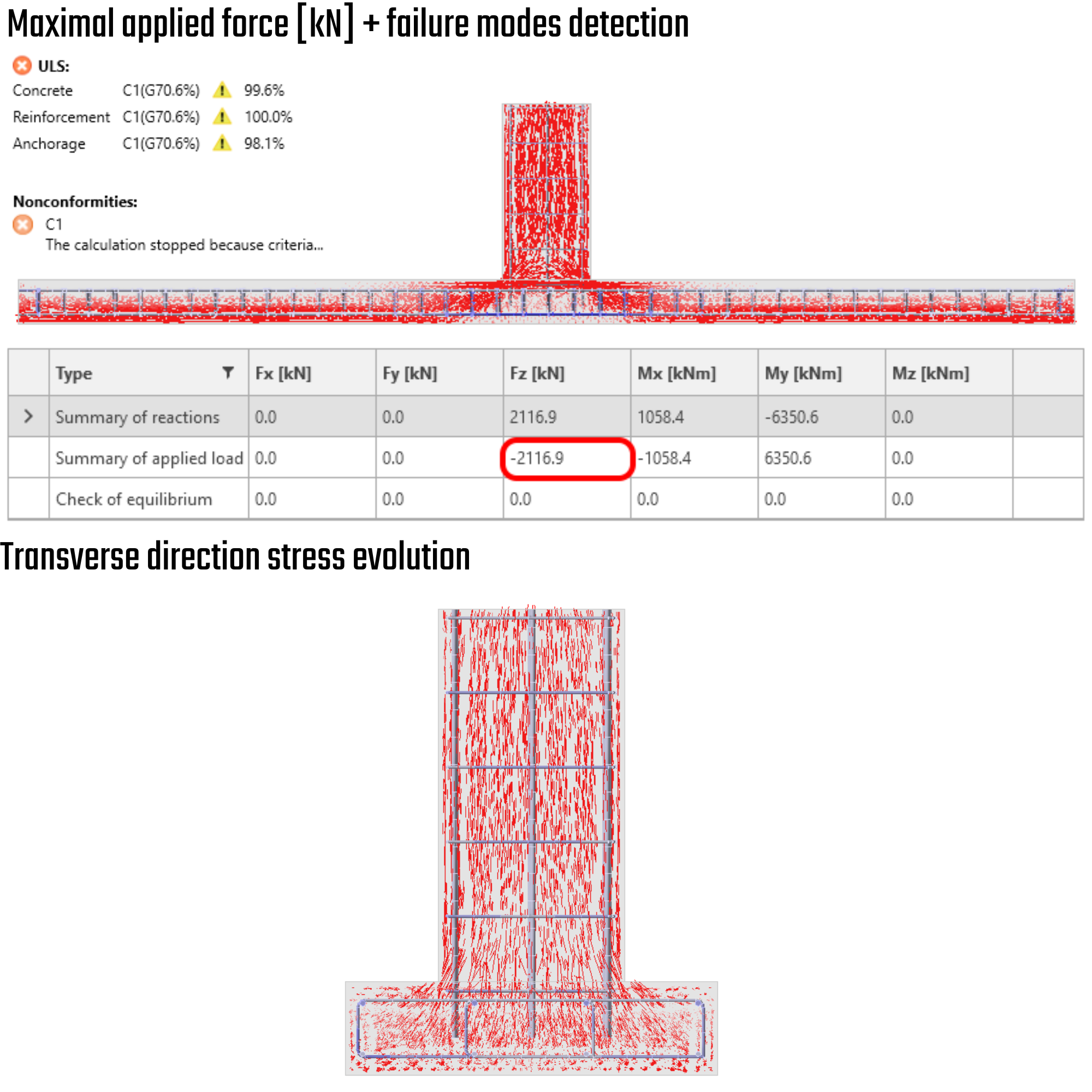 The force absorbed by the footing strip reached -2116 kN, which is approximately 215 % higher bearing capacity than in LSS. The failure mode involves concrete crushing, tensile rupture of the longitudinal reinforcement, and the horizontal legs of the stirrups in tension.