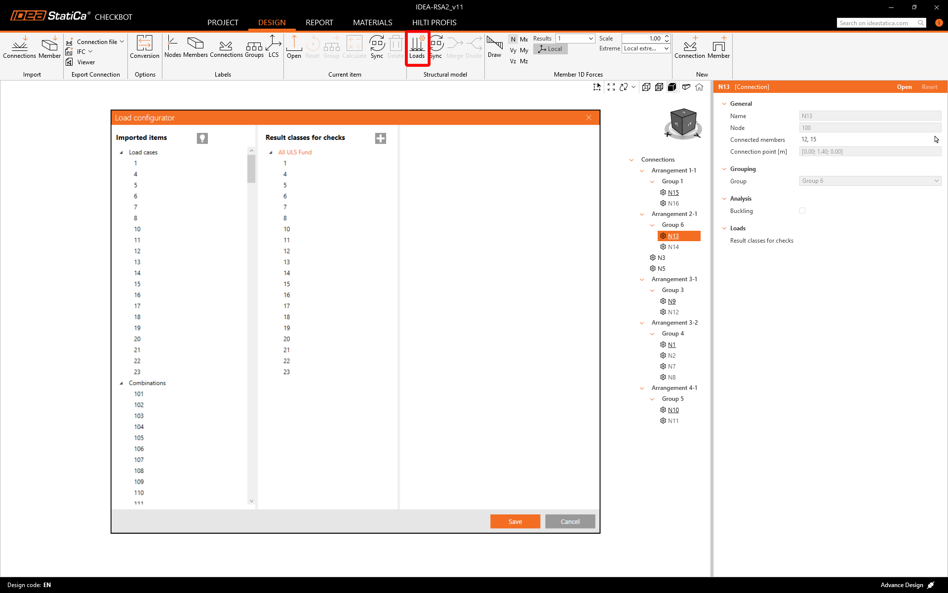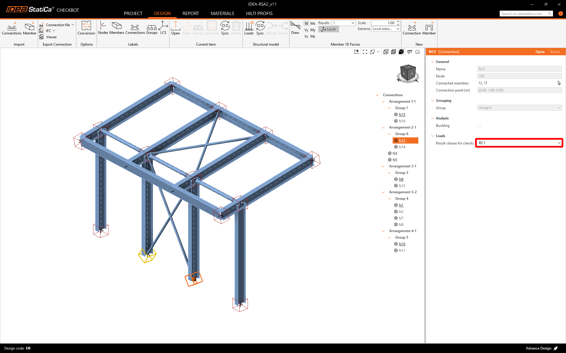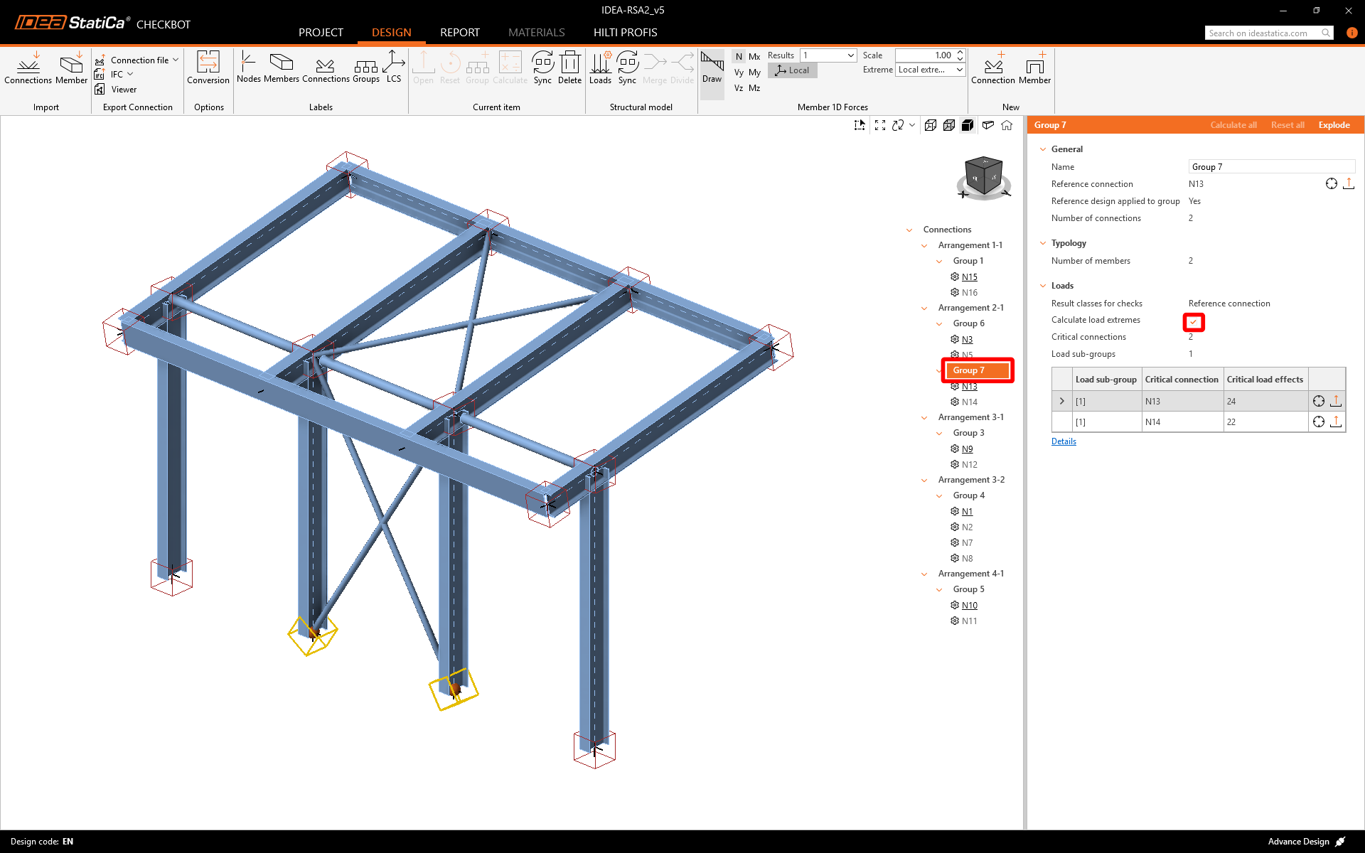 Now you can assign correct Result class to designed connection and activate Calculate load extremes for group. This allows you to design and check the connections only for Critical load effects.