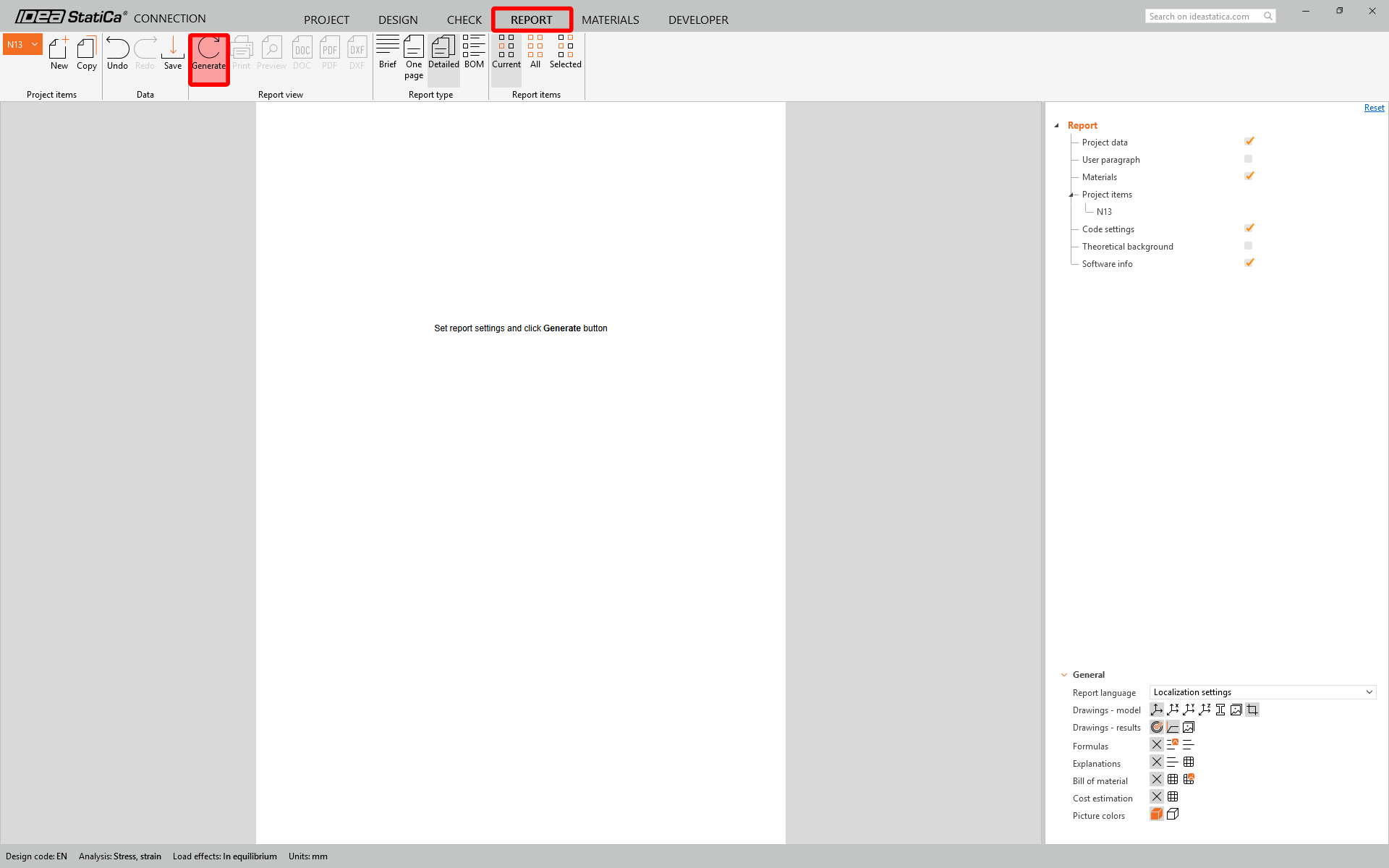 Once the code-check is finished in the Report tab, you can create the report containing results and diagrams for your connection model.