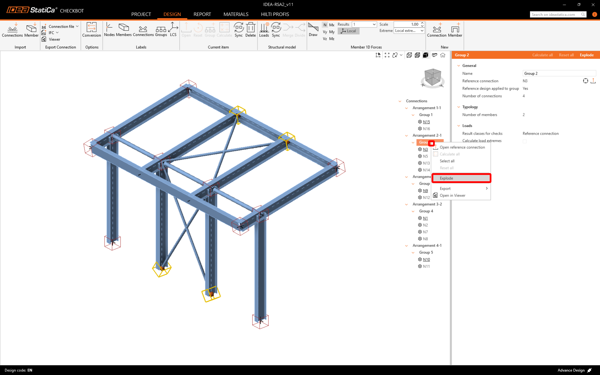 The grouping functionality automatically creates groups of connections based on typology and/or cross-sections. Every group is represented by the reference connection (underlined in the tree), which is automatically designated as the parent connection that drives the design for the whole group. All other connections are treated as child connections. If the groups aren´t created correctly, like in this case, you can Explode them and create new ones.