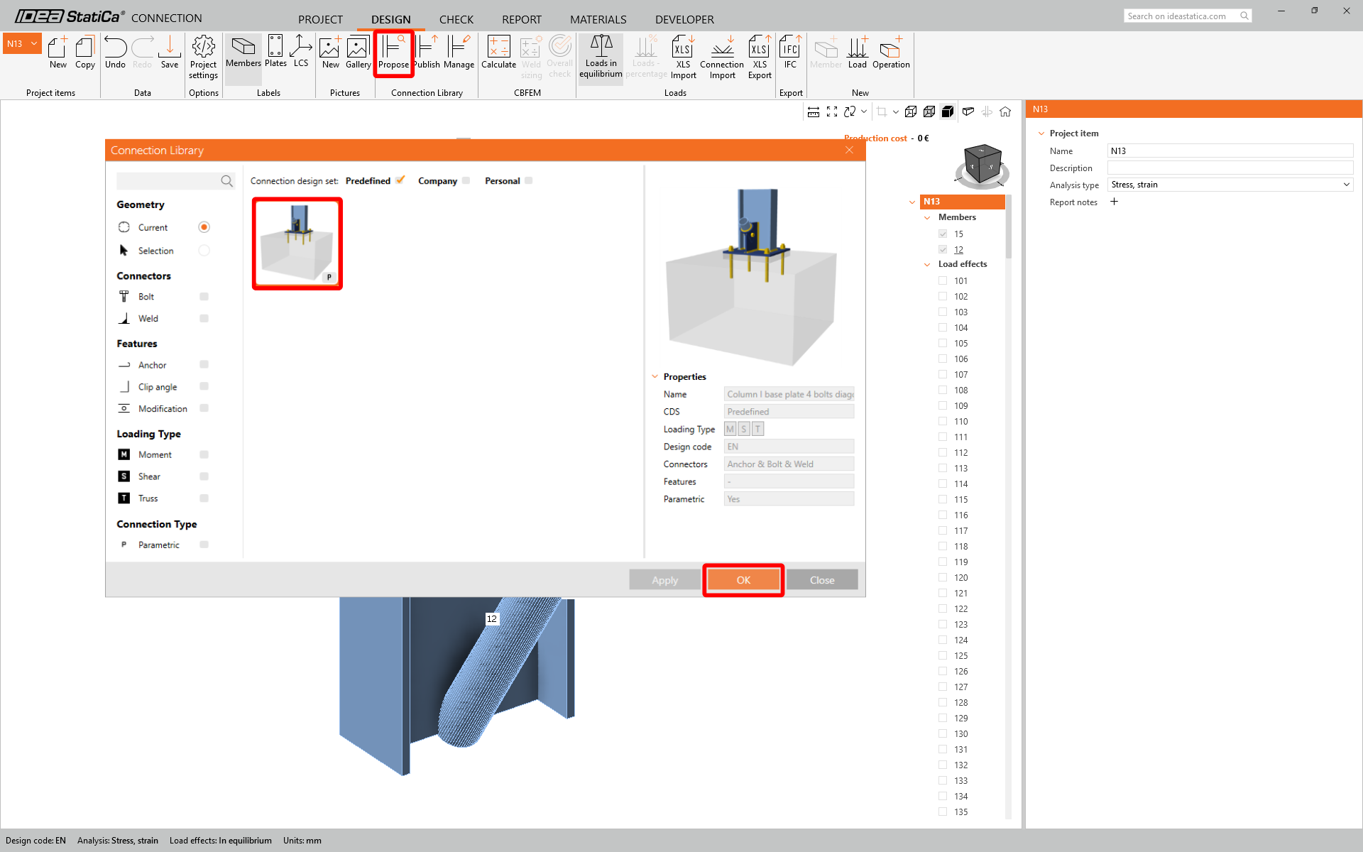 In this tutorial we are going to use the Connection Library to generate a connection. Select Propose and IDEA StatiCa will put forward possible solutions for the current geometry.
