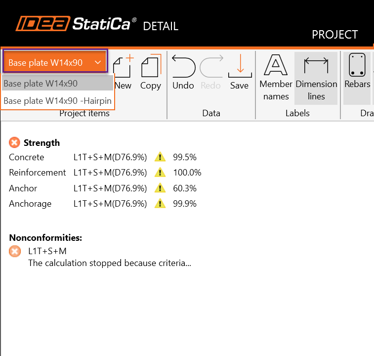 - Connection file: Base plate design in the Connection application, where the anchors fail for concrete breakout in tension.